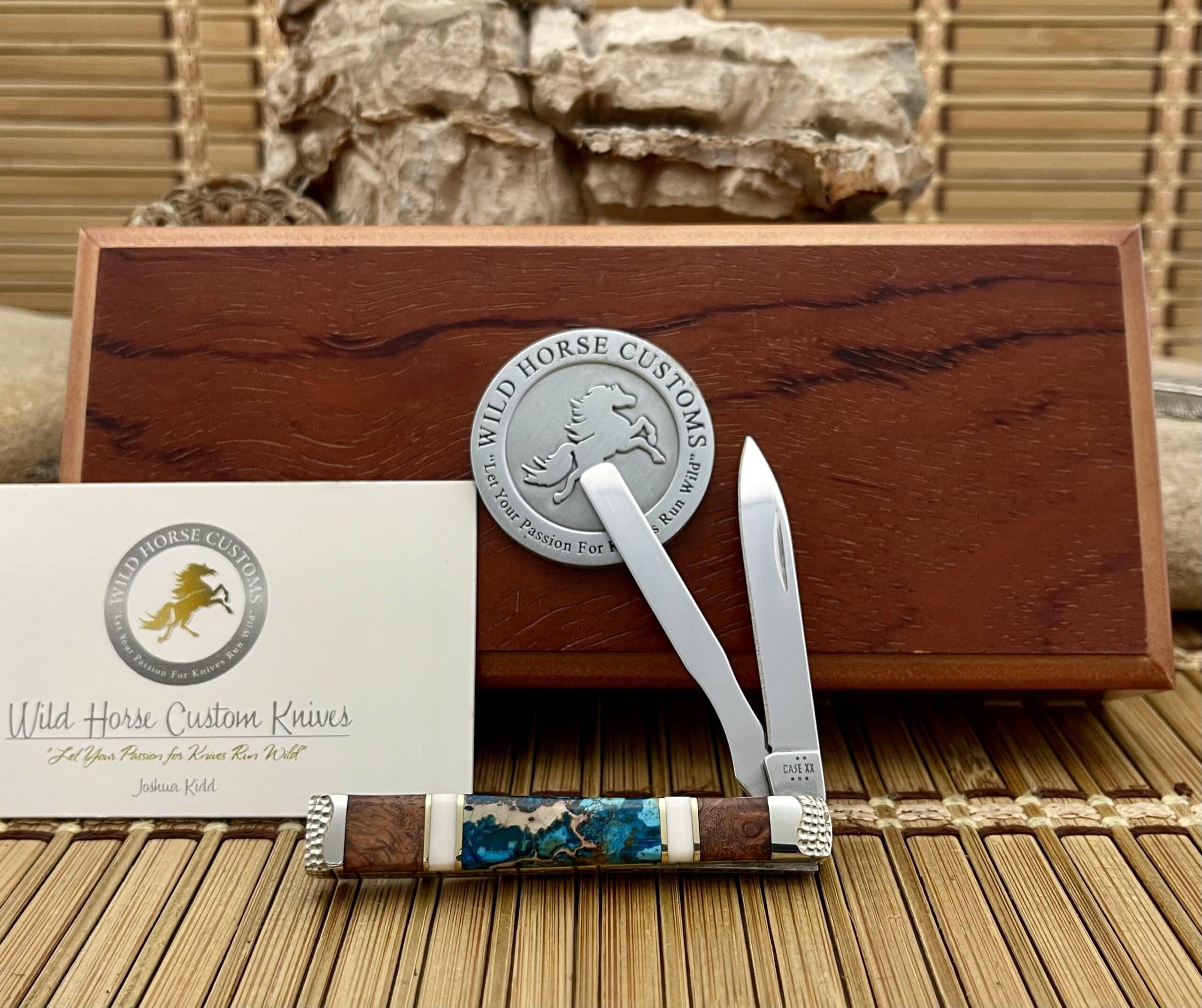 The bisbee turquoise baby doc knife from Case XX and Wild Horse Custom Knives is a one-of-a-kind collectible crafted by acclaimed custom artist J. Kidd. Serialized as #1 of only 1, this Baby Doc pattern combines rare natural materials with meticulous detailing.