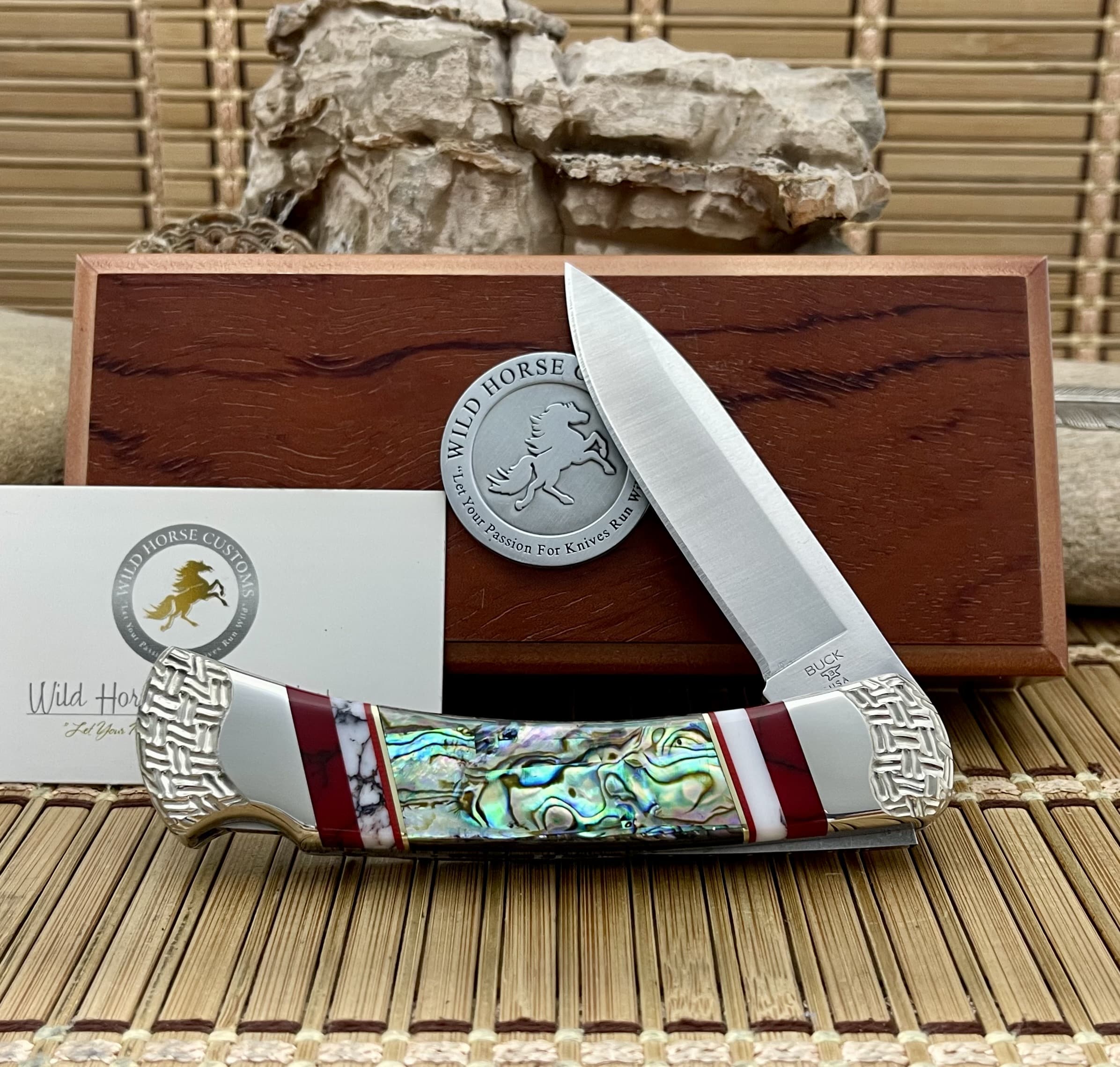 The buck 110 bloody jasper abalone hunter is a breathtaking fusion of the most famous folding hunter pattern in the world and elite custom artistry. This rare creation by J Kidd features an incredible combination of bloody jasper and abalone accented by precision inlays of wild horse jasper and blood coral. Every material is polished to an incredible shine creating a vibrant handle that is as durable as it is beautiful. As a signed and numbered collectible this specific knife is marked #03 of only 10 made ensuring its place as a highly sought after investment.