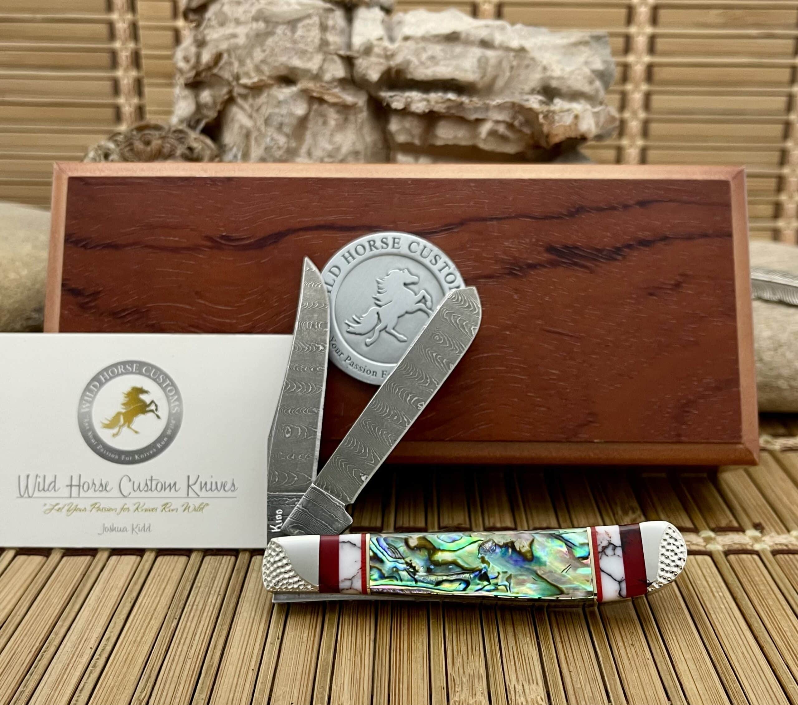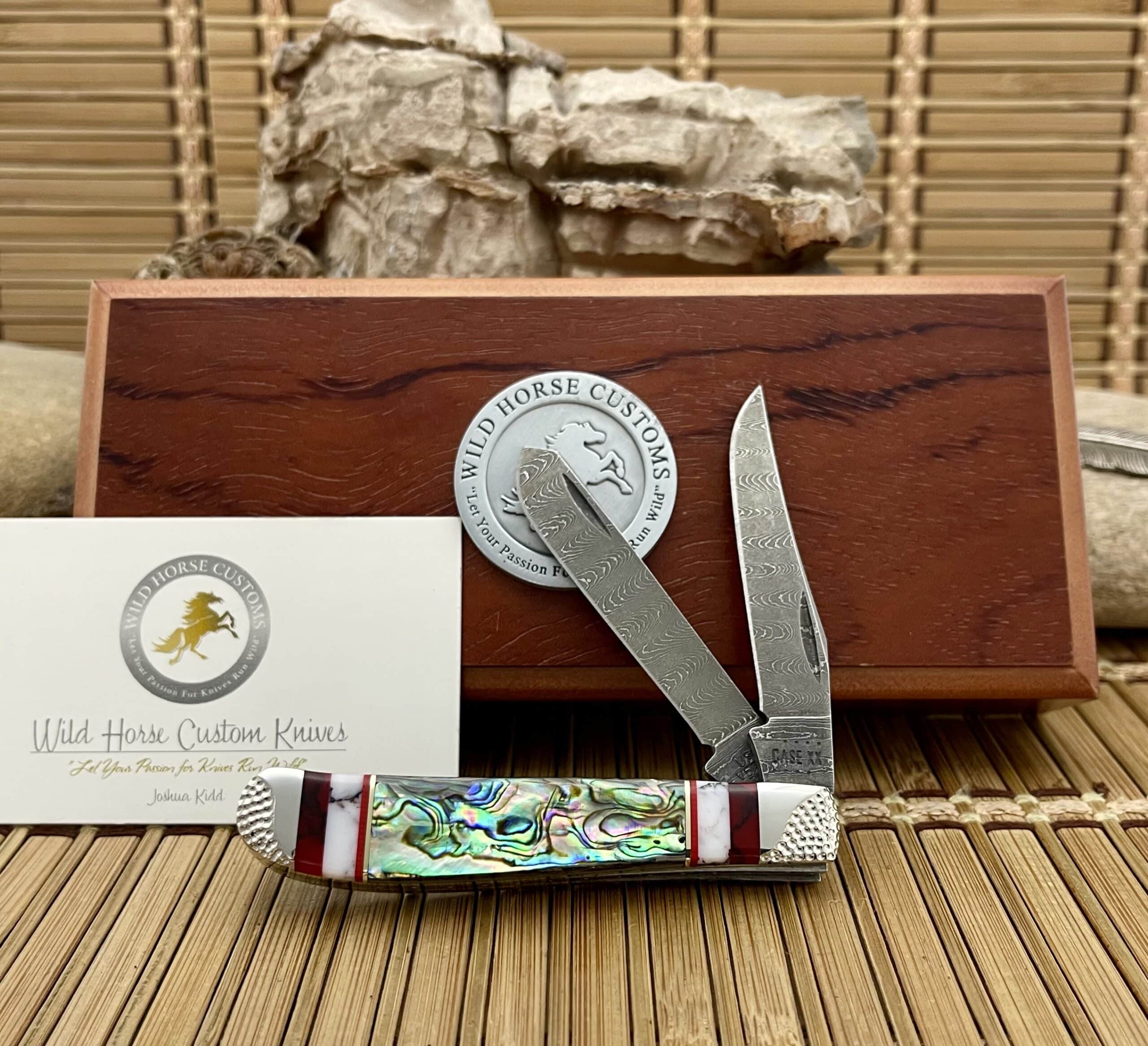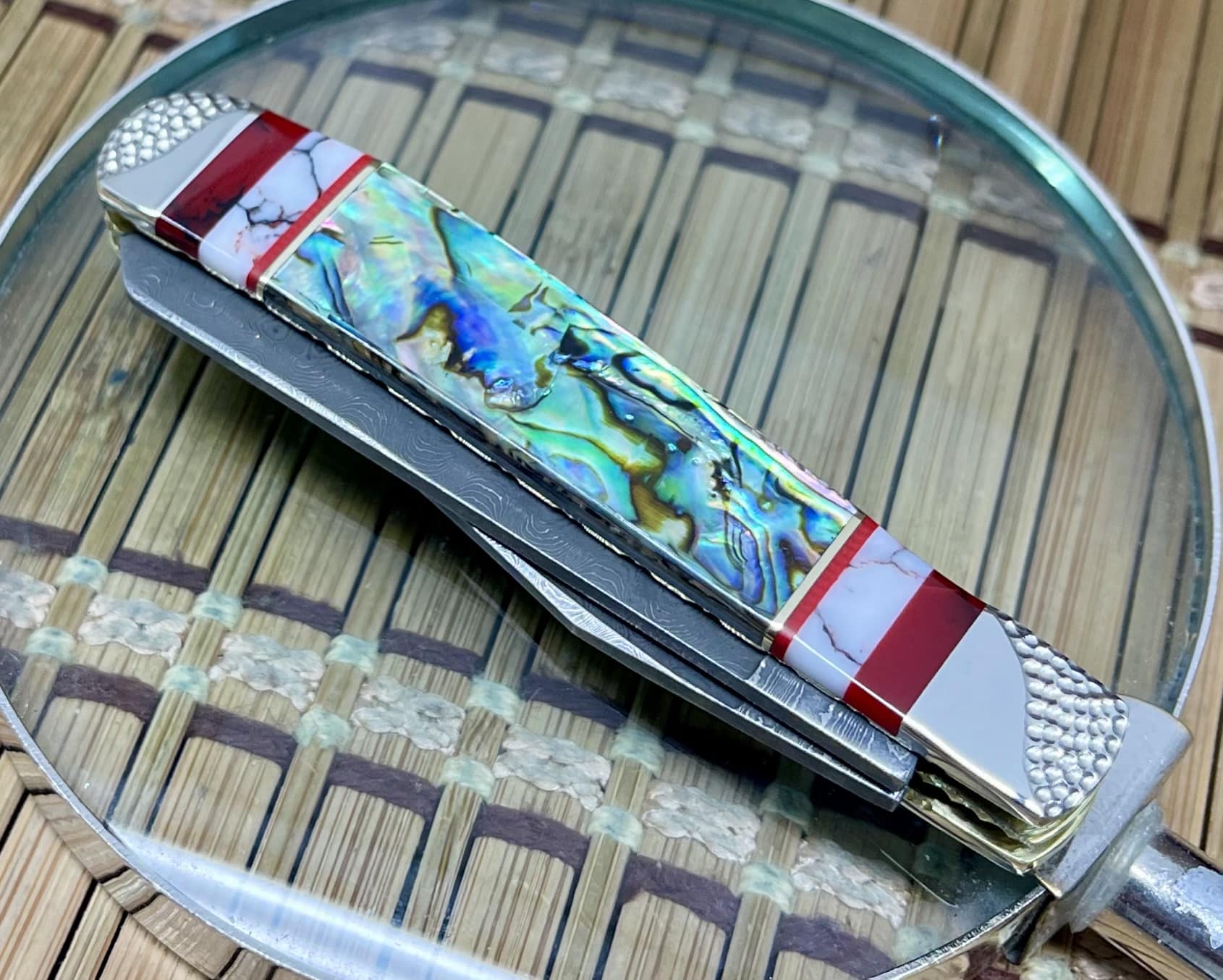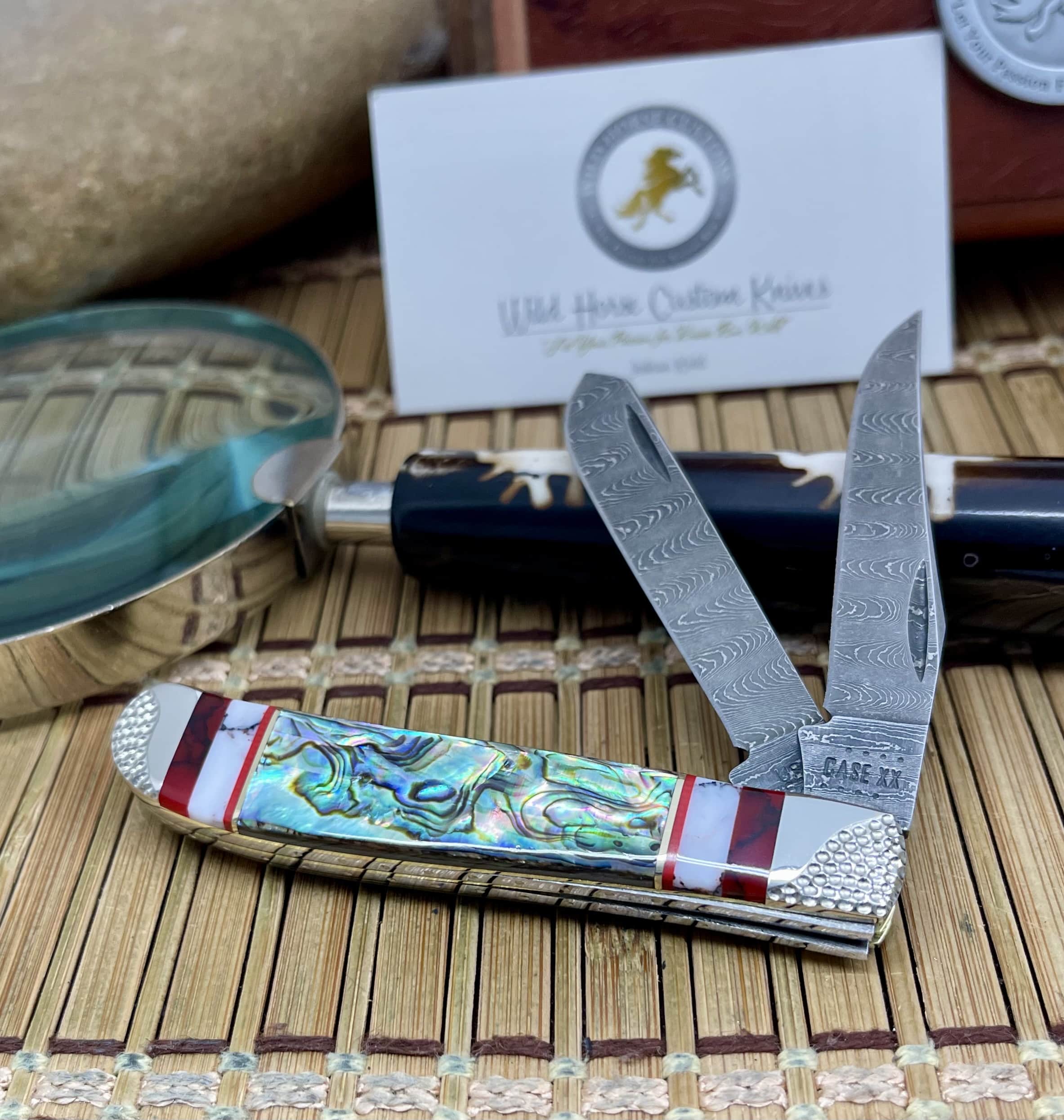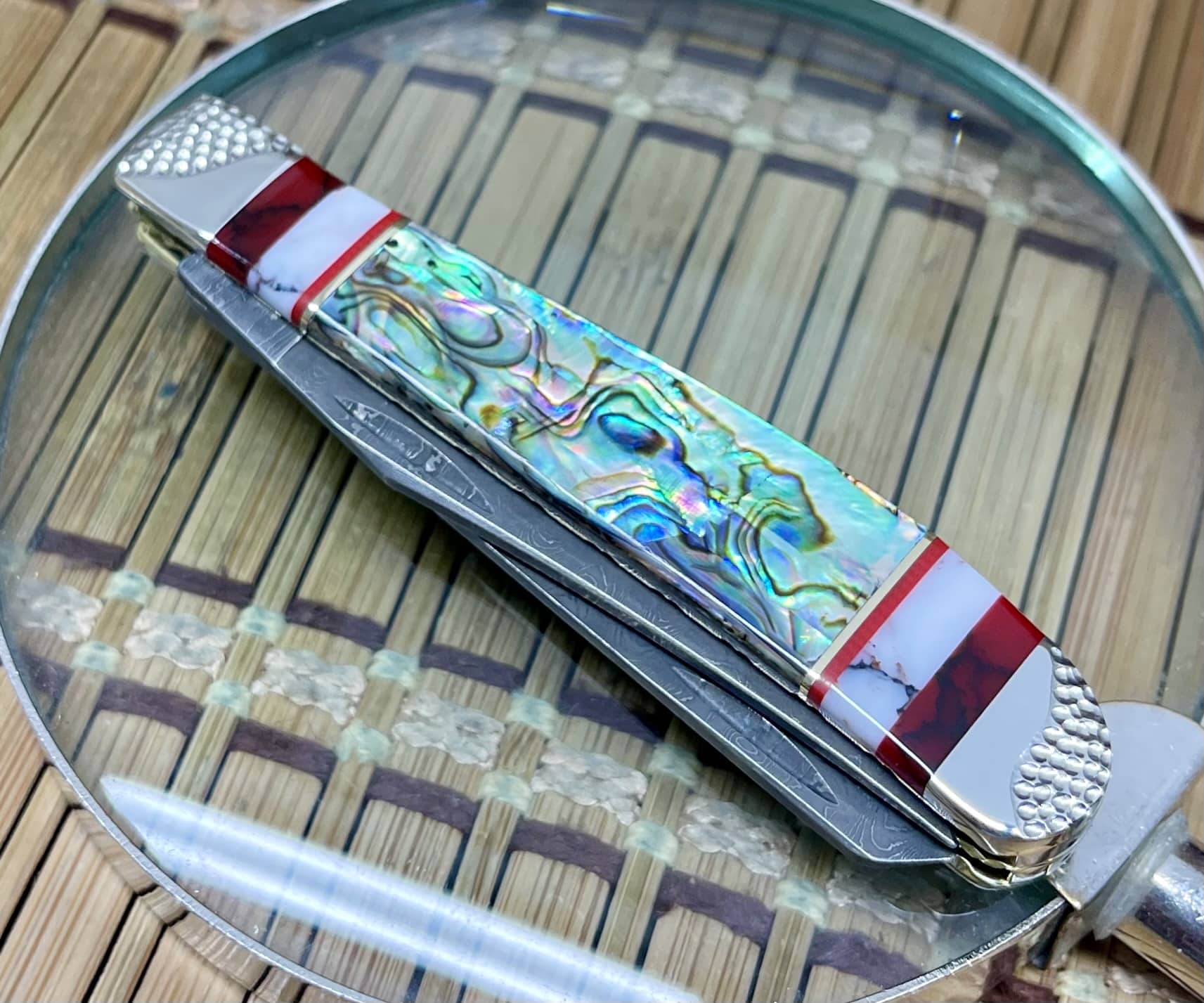 This case abalone jasper mini trapper knife showcases genuine exotic Paua Abalone, Bloody Jasper, and Wild Horse Jasper, accented with nickel-silver and blood coral channel inlays that gleam with unmatched brilliance. Engraved nickel-silver bolsters, a fileworked backspring, and hand-filed liners bring it to life as a piece of functional art.