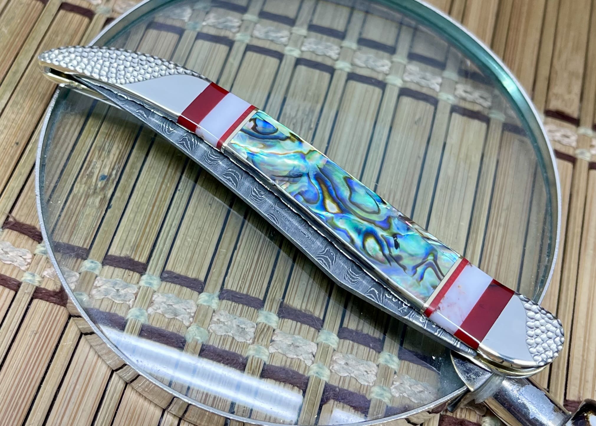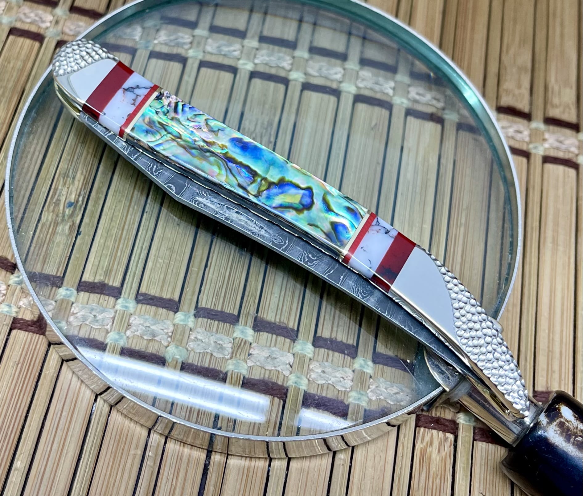 This case abalone toothpick knife features genuine exotic Paua Abalone, Bloody Jasper, and Wild Horse Jasper, accented by channel inlays of nickel silver and blood coral. Every surface is polished to a mirror finish, giving this piece a truly eye-catching shine.