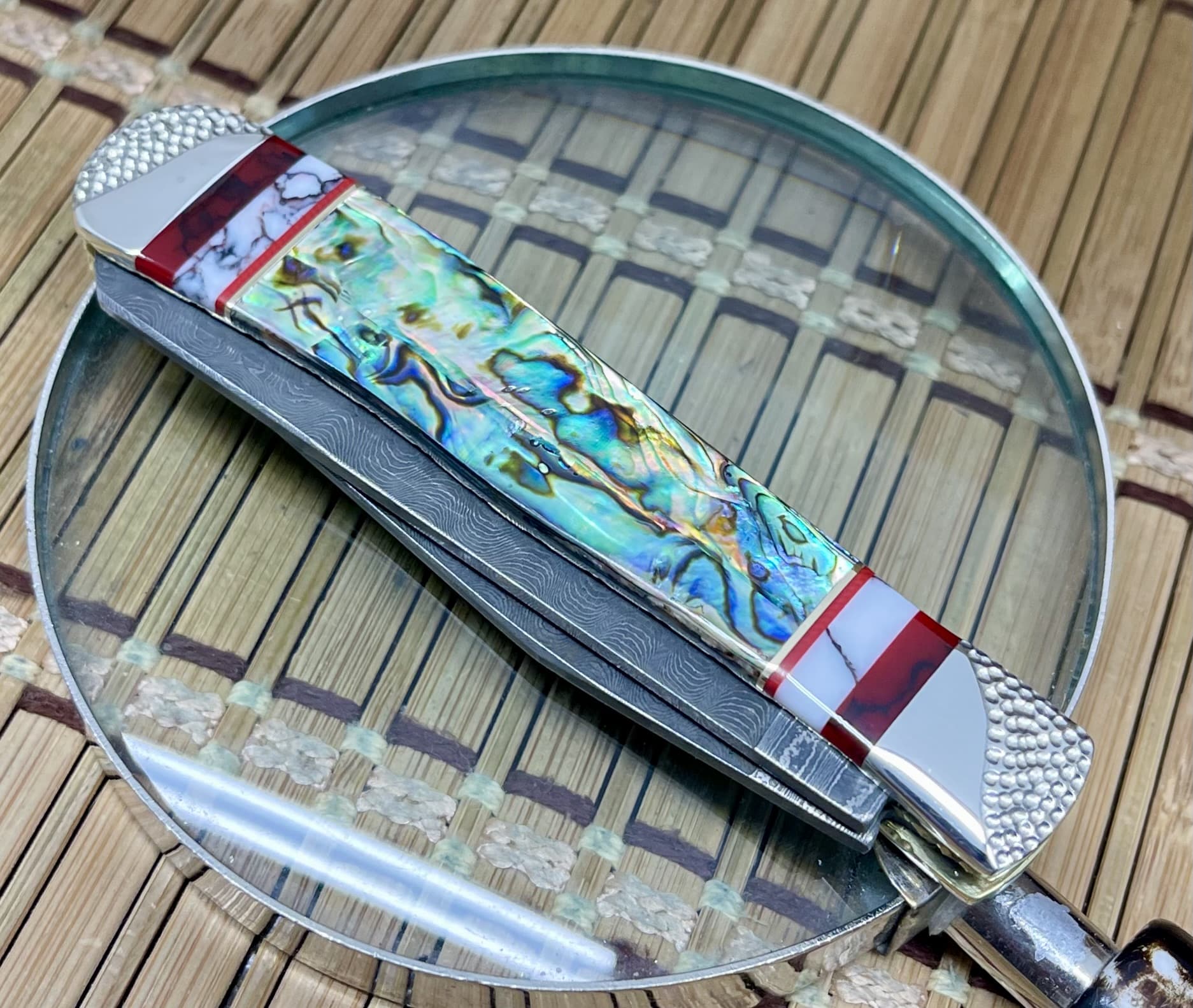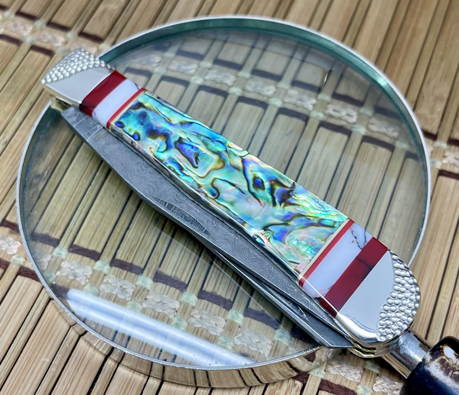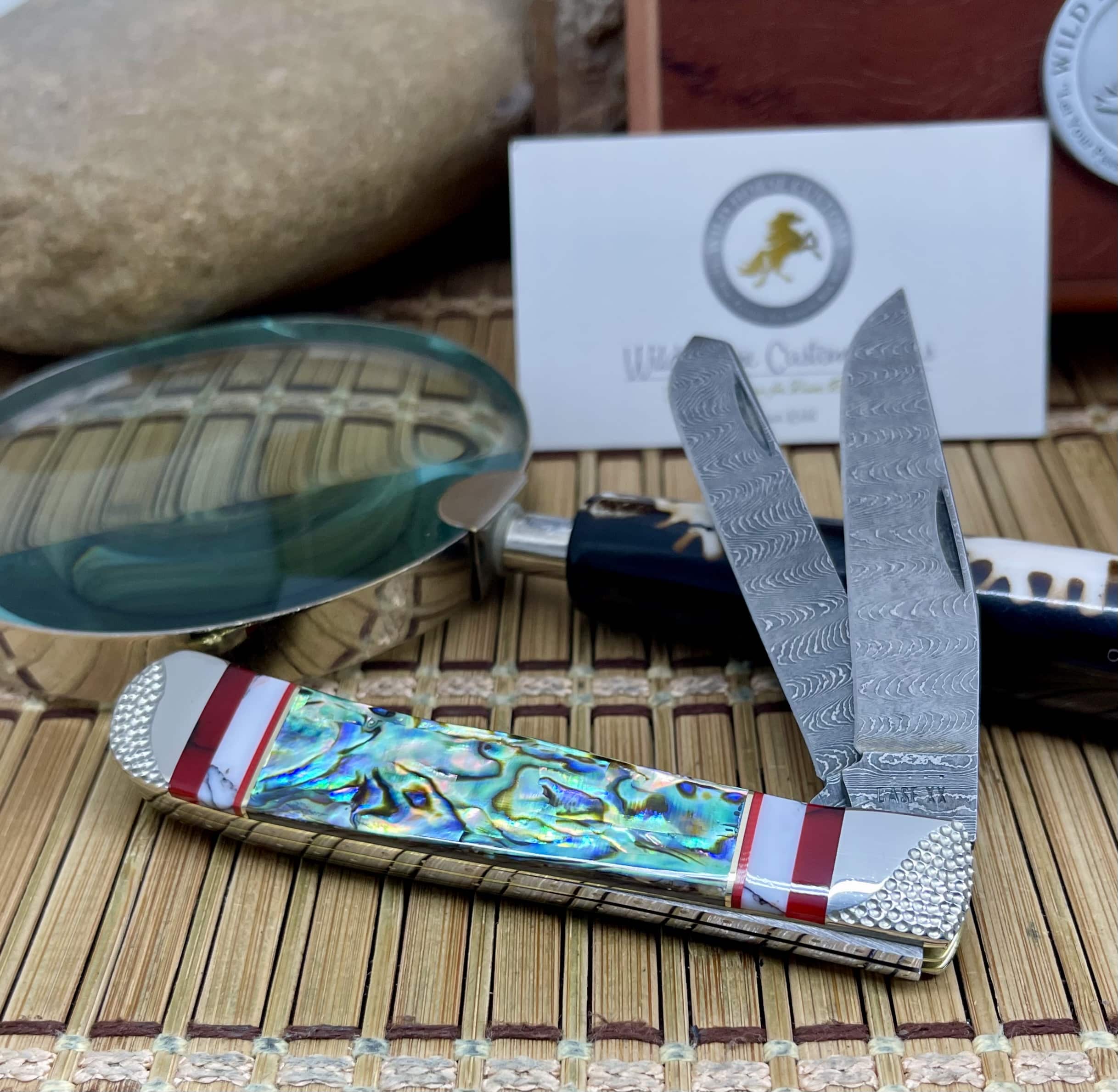This case abalone trapper knife features exotic Paua Abalone, Bloody Jasper, and Wild Horse Jasper, accented with channel inlays of nickel silver and blood coral for incredible depth and brilliance.