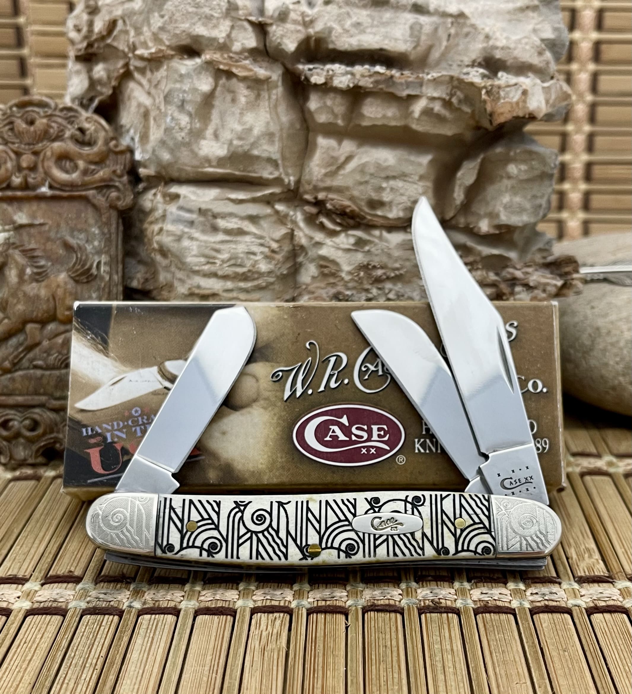 The case antique bone art deco stockman is a sophisticated example of themed cutlery that captures the elegance of early twentieth century design. This 2011 edition features smooth antique bone handles that serve as a clean canvas for the detailed Art Deco artwork. The warm, aged tones of the bone provide a timeless aesthetic that perfectly complements the geometric styling of the period-inspired graphics. This model is a standout choice for collectors who appreciate the intersection of traditional pocket knife patterns and classic artistic movements.