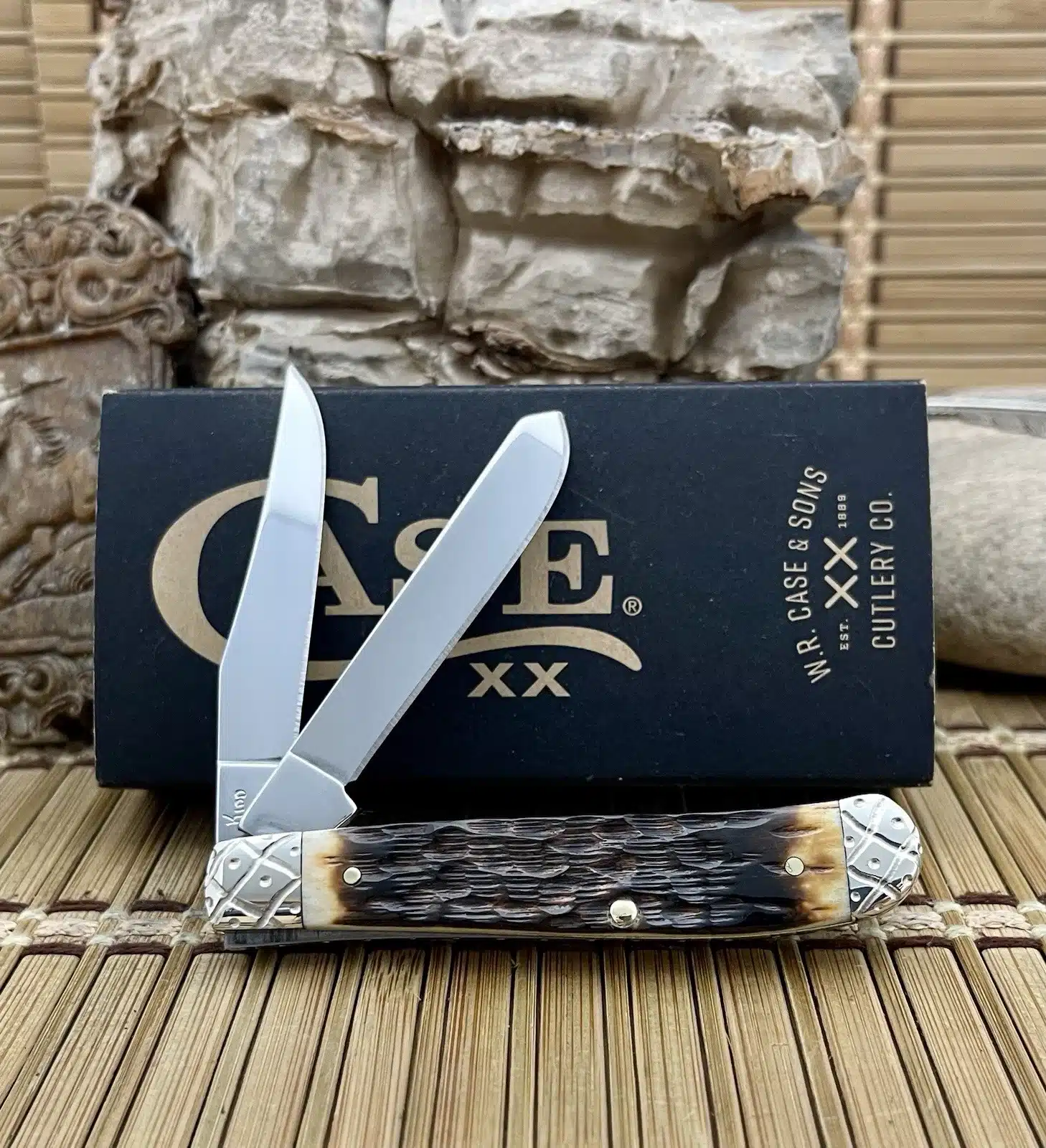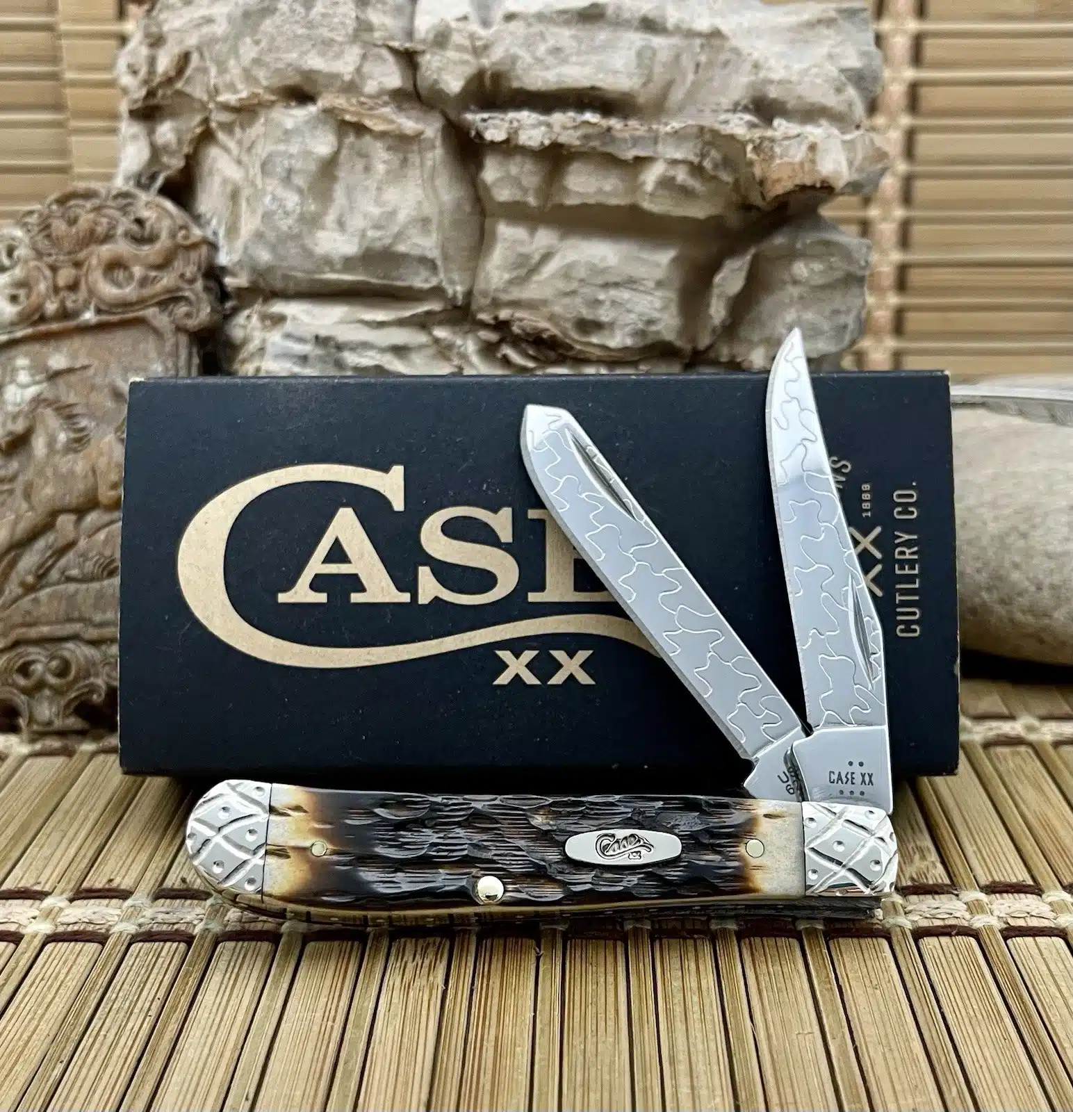 This case hand fired amber bone mini trapper is an absolutely Beautiful and CUSTOM collectible, presenting the popular Mini Trapper pattern with luxurious enhancements. The knife has been upgraded by Wild Horse Customs, featuring striking Hand-Fired Peachseed Amber Bone handle scales that exhibit a rich color and unique, textured feel.
