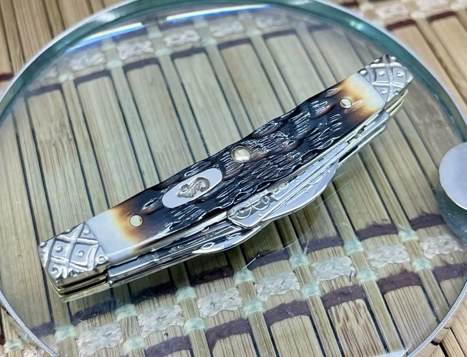 This case hand fired amber bone small congress is an absolutely Beautiful and CUSTOM collectible, showcasing the timeless Congress pattern with luxurious enhancements. The knife has been upgraded by Wild Horse Customs, featuring striking Hand-Fired Peachseed Amber Bone handle scales that exhibit a rich color and unique, textured feel.