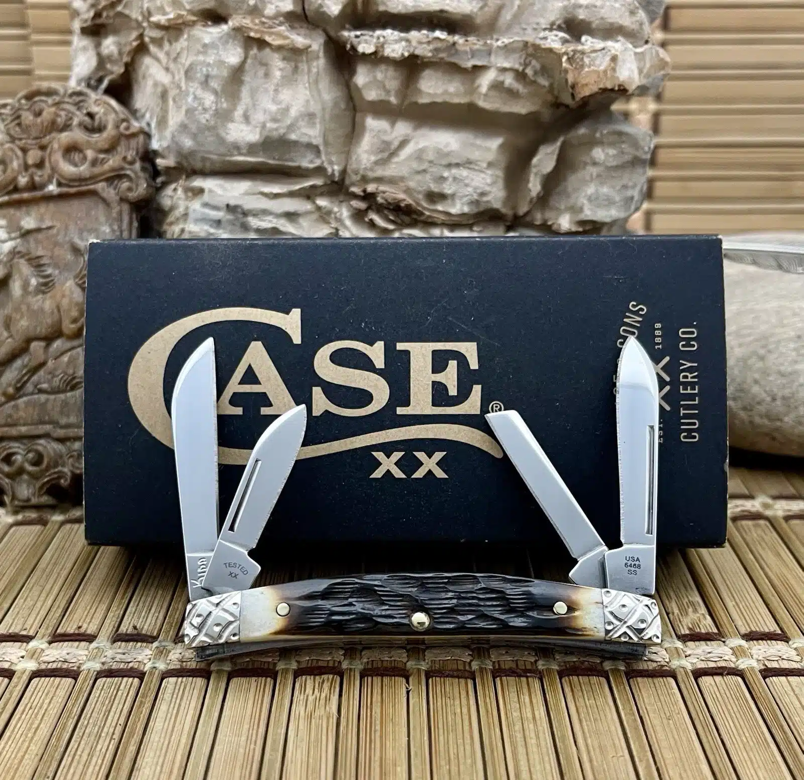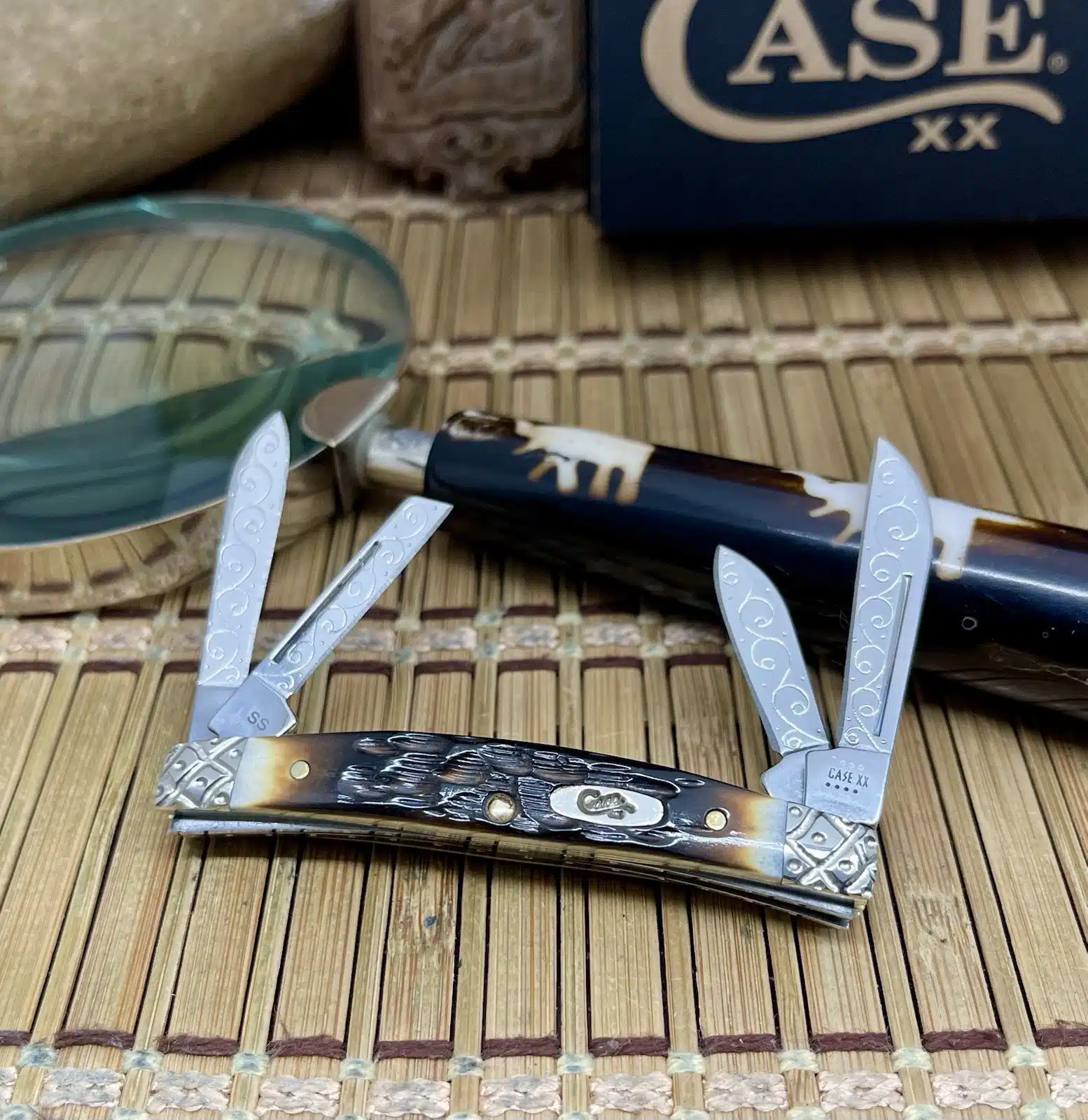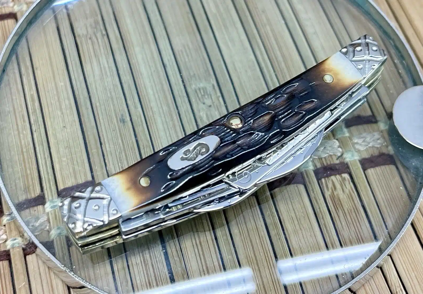 This case hand fired amber bone small congress is an absolutely Beautiful and CUSTOM collectible, showcasing the timeless Congress pattern with luxurious enhancements. The knife has been upgraded by Wild Horse Customs, featuring striking Hand-Fired Peachseed Amber Bone handle scales that exhibit a rich color and unique, textured feel.