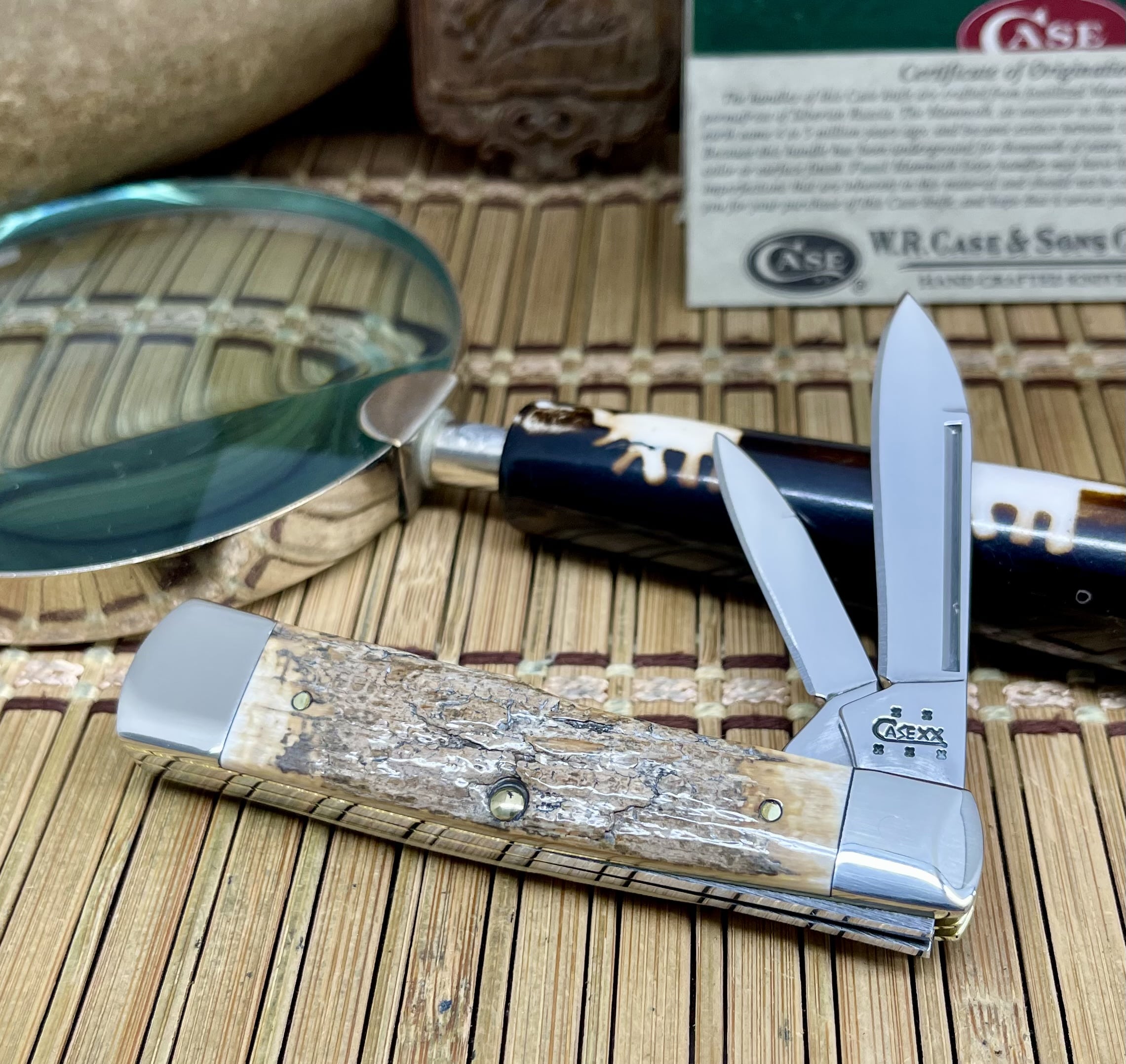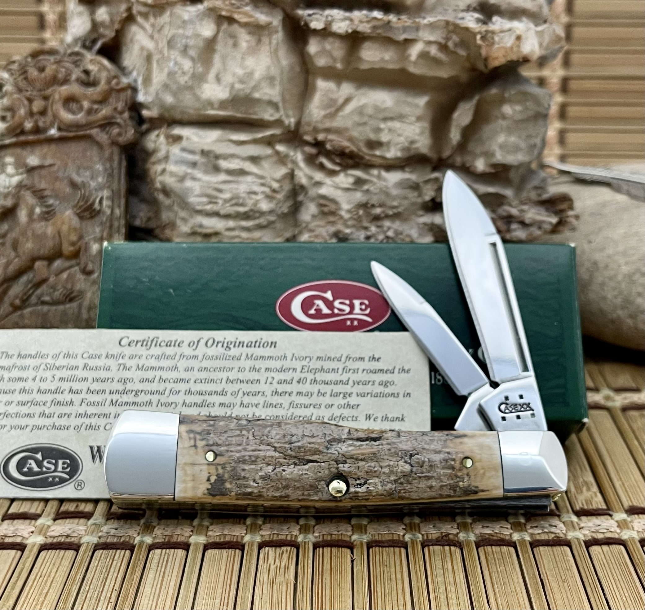 The knife is equipped with two blades—a Clip and a Pen—both meticulously crafted from Case’s signature Tru-Sharp Surgical Stainless Steel, known for its exceptional edge retention and corrosion resistance. The fit and finish are superb, as expected from a high-end Case XX collectible. The Large Gunstock is an Ultra Rare pattern, and when paired with such exotic material, it becomes an indispensable addition. It measures 3 ⅝” closed and comes new in the original box with the Certificate of Origin, directly from W.R. Case & Sons. This outstanding collectible, the case mammoth bark fossil gunstock knife, was proudly Made in Bradford, PA, USA.