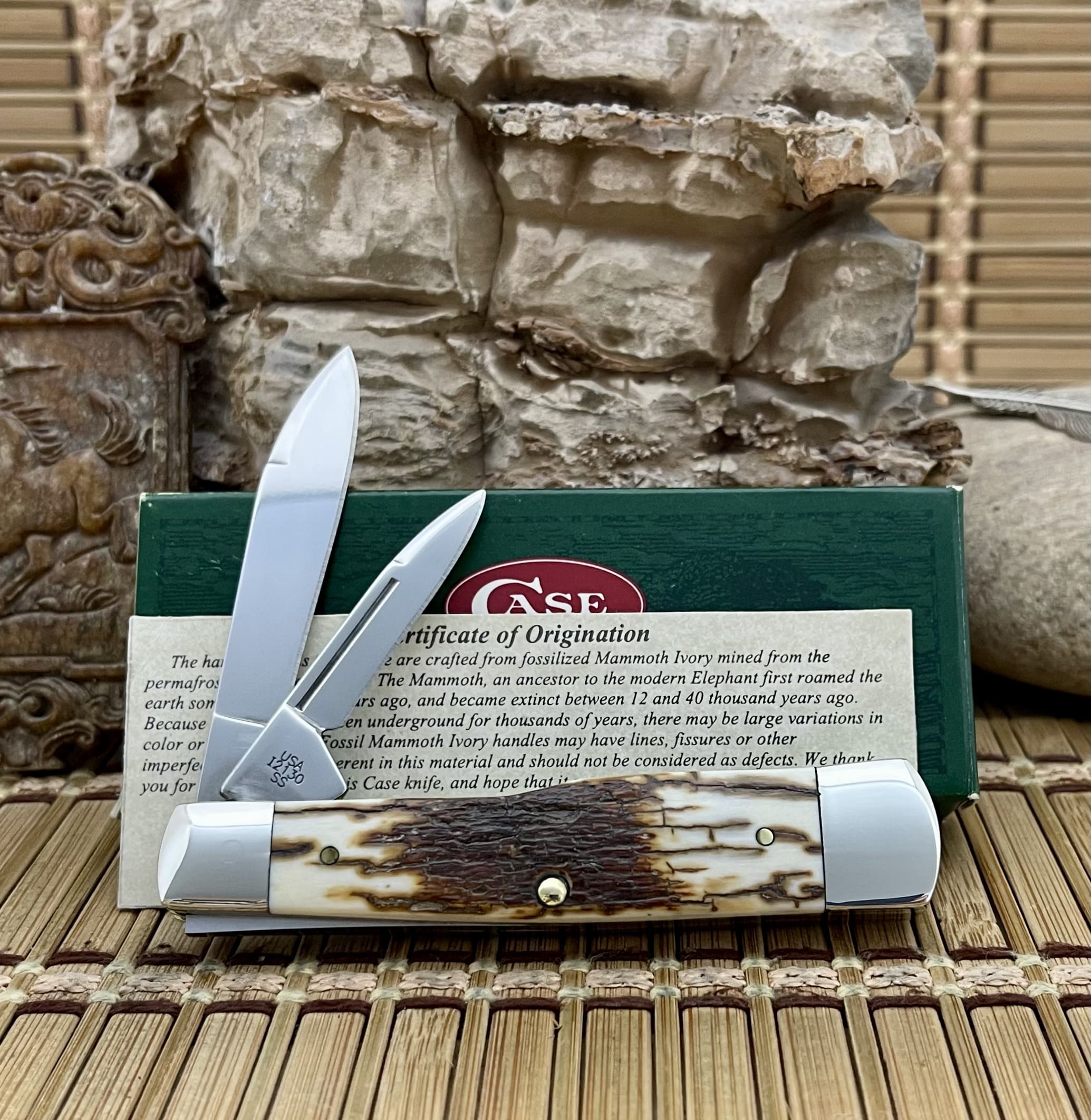 This case mammoth bark fossil gunstock knife is a testament to the blend of ancient materials and modern craftsmanship. The stunning Large Gunstock pattern (I2130 SS) features highly figured handle scales sourced from 20,000-year-old mammoth bark fossil. This exotic material provides a unique texture and color that makes this knife a true standout for any serious collector.