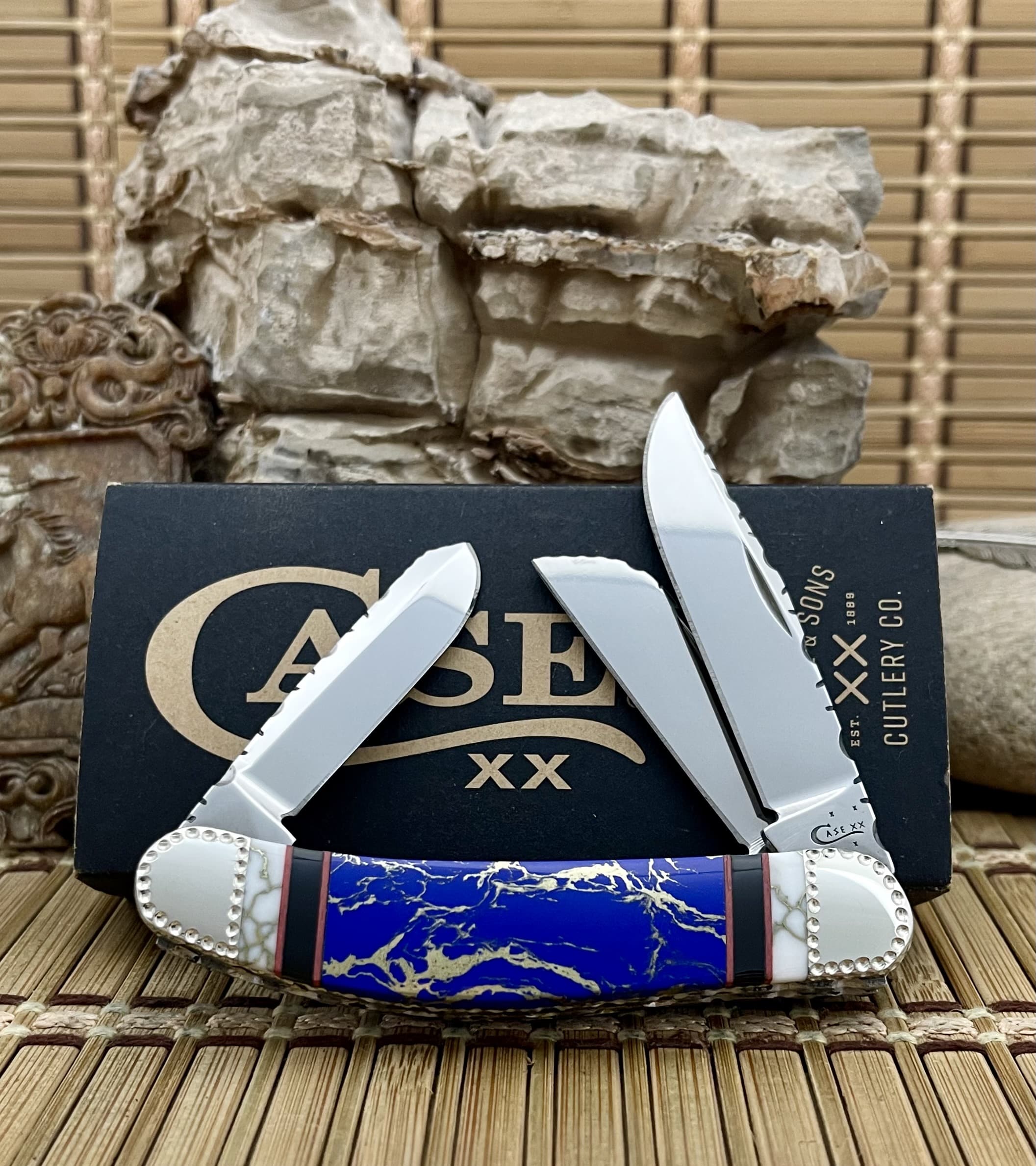 The case painted pony sowbelly knife is a beautifully handcrafted collector’s piece showcasing the signature artistry of the Painted Pony series. This exquisite custom sowbelly features exotic Gold Vein Lapis Lazuli, Gold Vein White Turquoise, and deep Black Onyx handles, each precisely fitted to create a brilliant contrast of texture and color.