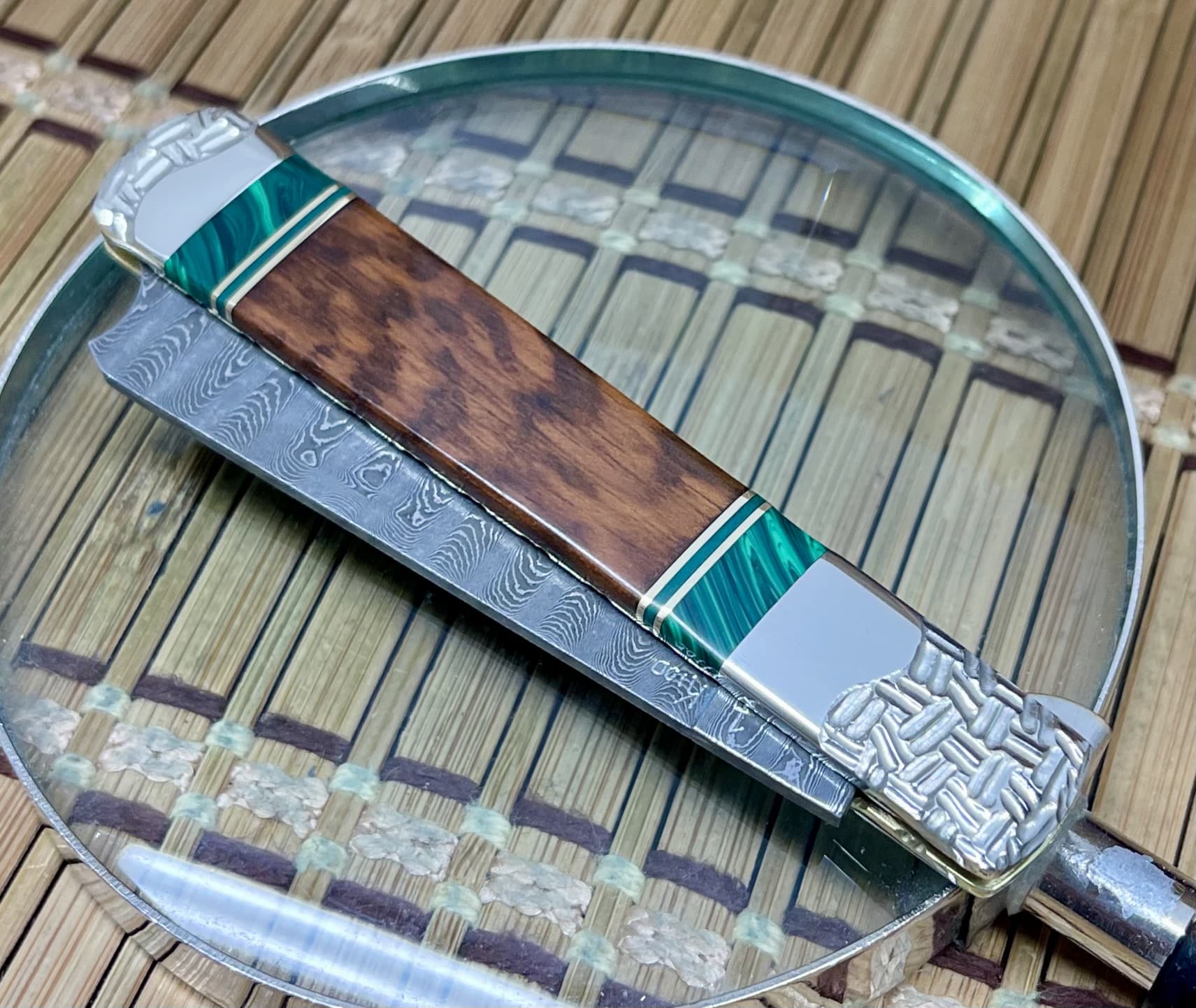 This case snakewood malachite damascus razor knife showcases exhibition-grade Snakewood paired with vivid Malachite, creating a rich and elegant contrast with an incredible natural shine. Engraved nickel-silver bolsters, fileworked liners, and a hand-detailed backspring highlight Kidd’s signature craftsmanship.