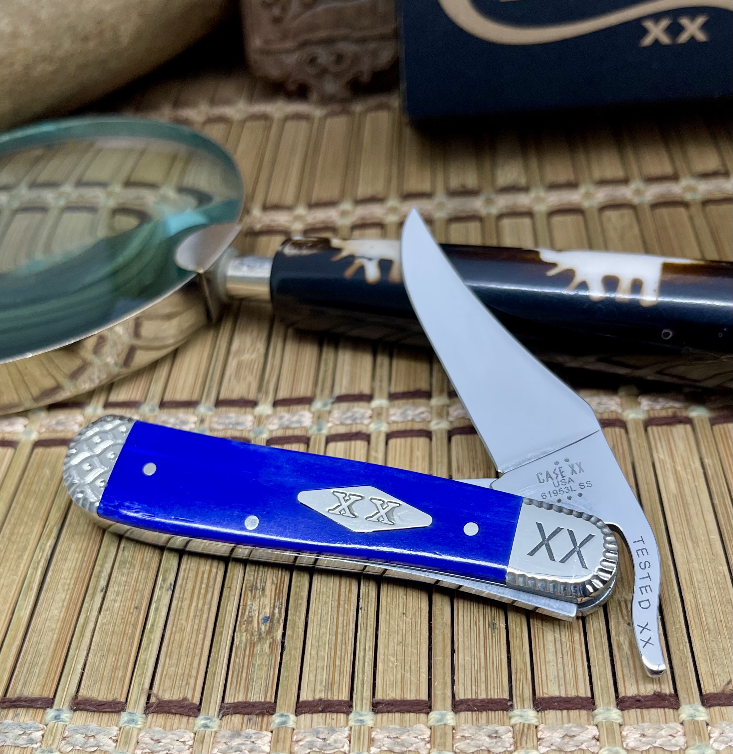 The case ultra violet bone engraved russlock is a bold, contemporary custom that instantly stands out in any collection. The smooth ultra violet bone handles radiate an intense electric purple that shifts from deep royal to vivid magenta in different lighting—one of Case’s most dramatic and desirable bone colorations ever produced. A polished Diamond XX shield is perfectly inlaid, adding that extra mark of exclusivity collectors love.
