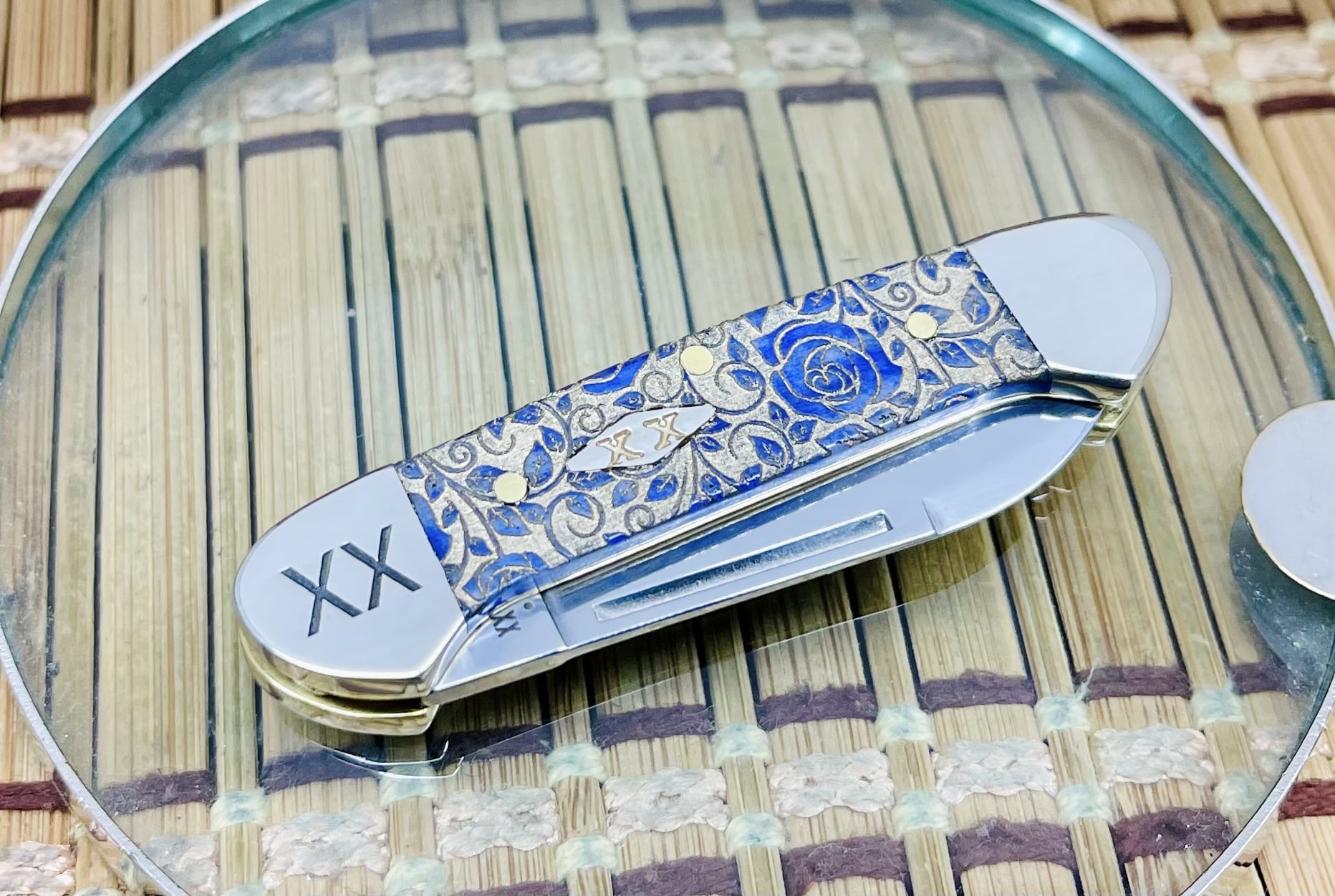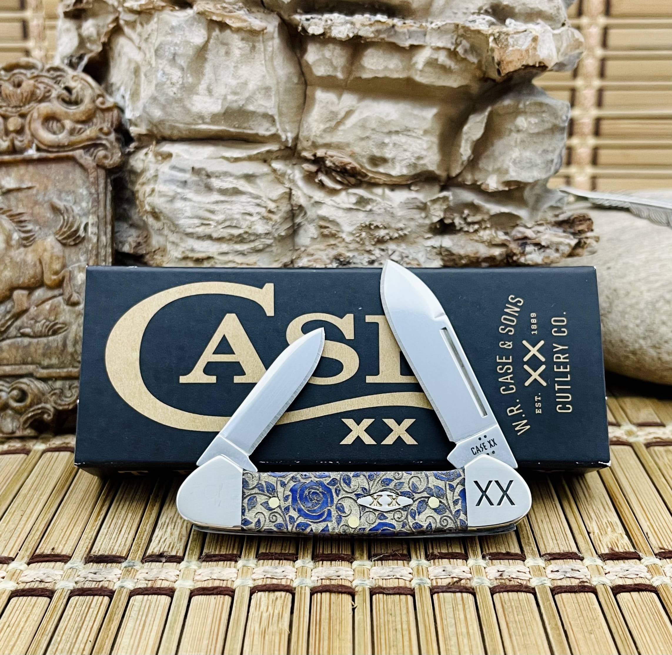 The case ultra violet bone roses butterbean is a charming limited-edition gem from Case XX’s 2025 Roses series, capped at just 500 pieces worldwide and further distinguished through highly limited customizations by Wild Horse Custom Knives. The handles are fashioned from premium ultra violet bone, emitting a deep electric purple that dances in the light for a captivating visual allure. Detailed with intricate roses artwork, the scales combine floral grace with refined style, highlighted by the polished Diamond XX shield embedded seamlessly for an added layer of exclusivity.