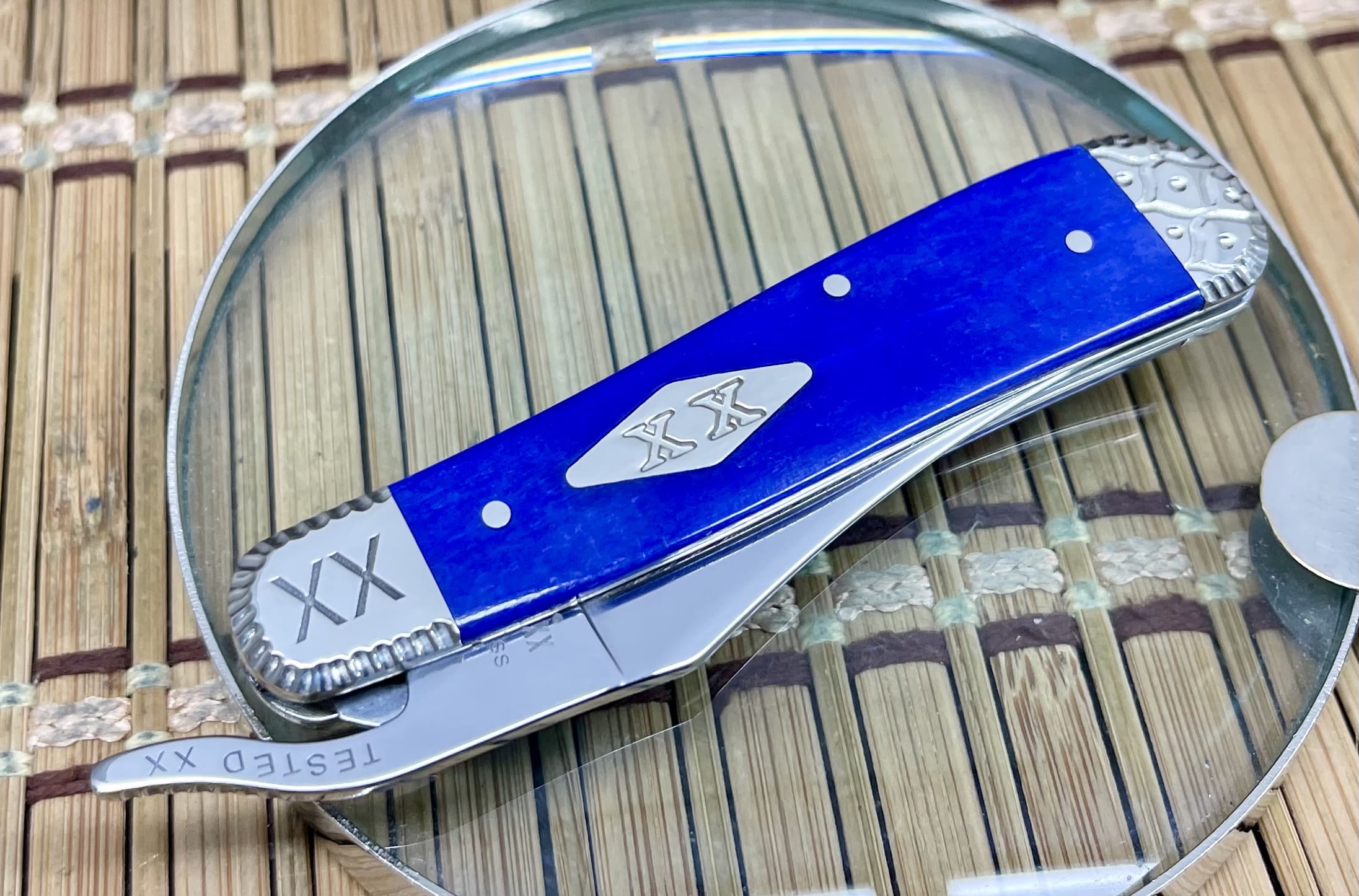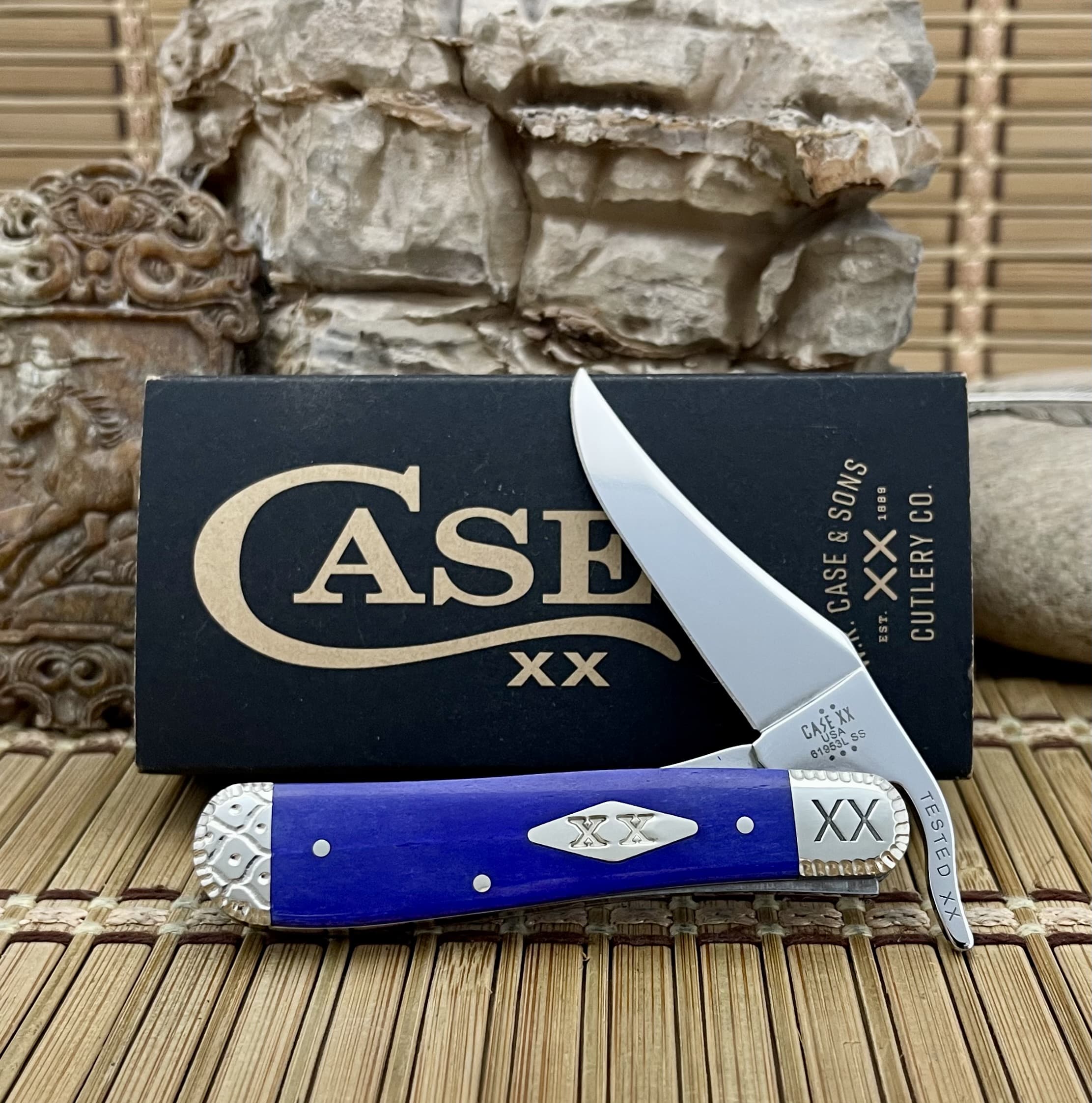 A Diamond XX shield is neatly inlaid on the mark side, adding a crisp Case hallmark to the contemporary handle. Engraved nickel silver bolsters frame the bone at both ends, bringing refined detail and a touch of traditional elegance to this modern-feeling build. The Tru-Sharp Surgical Stainless Steel blade offers excellent edge retention and corrosion resistance, and the Russlock’s extended tang and locking mechanism provide the unique opening action and secure lockup that collectors enjoy.