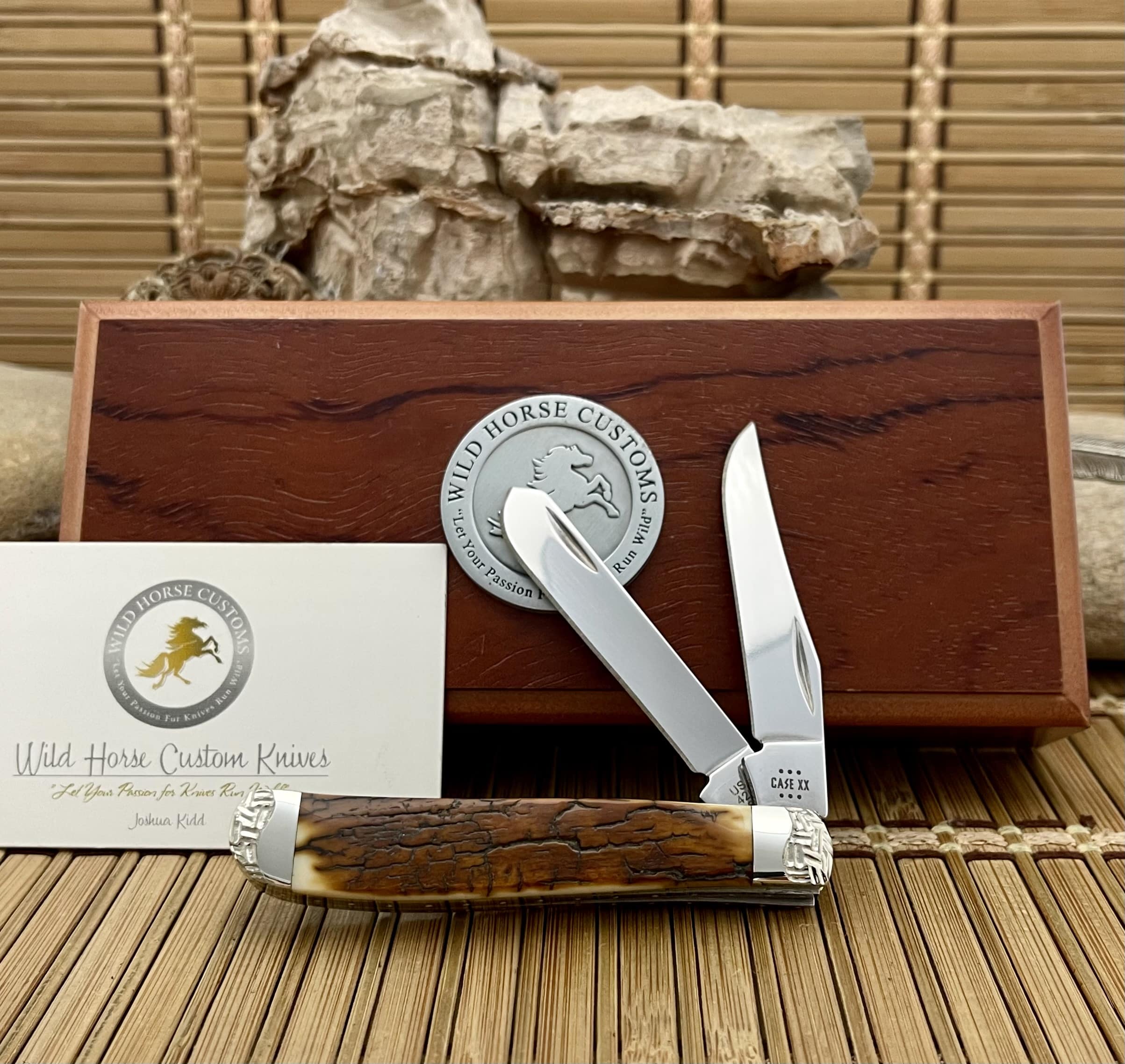 Presented brand new in a high-end Bubinga wood display box and accompanied by a Certificate of Authenticity, the case wild horse custom mini trapper knife exemplifies both artistry and craftsmanship. For collectors of Case XX patterns and J. Kidd customs, this knife is a rare opportunity to own a limited-edition work of art.