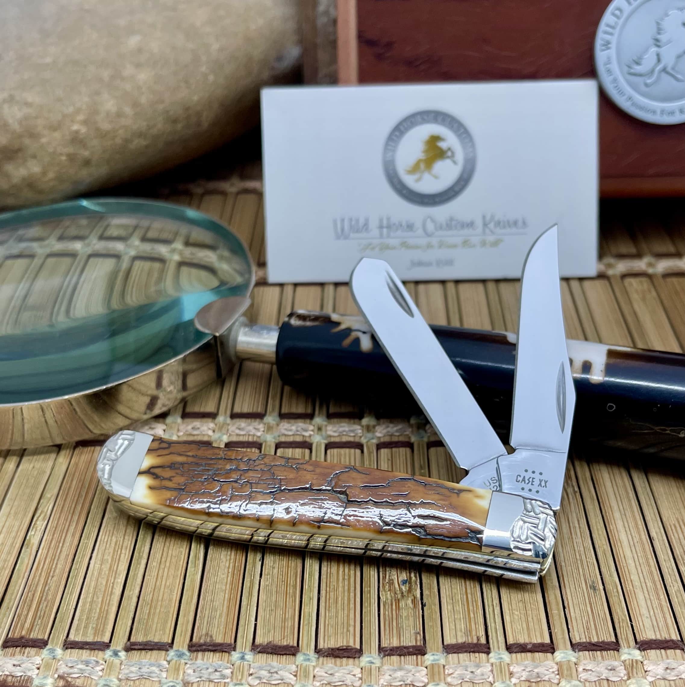 The case wild horse custom mini trapper knife is a rare and highly collectible creation from knife artist J. Kidd, owner of Wild Horse Custom Knives. Produced as part of a limited run of only 100 knives, each piece is hand-finished and uniquely signed and numbered, making it a true investment for collectors.
