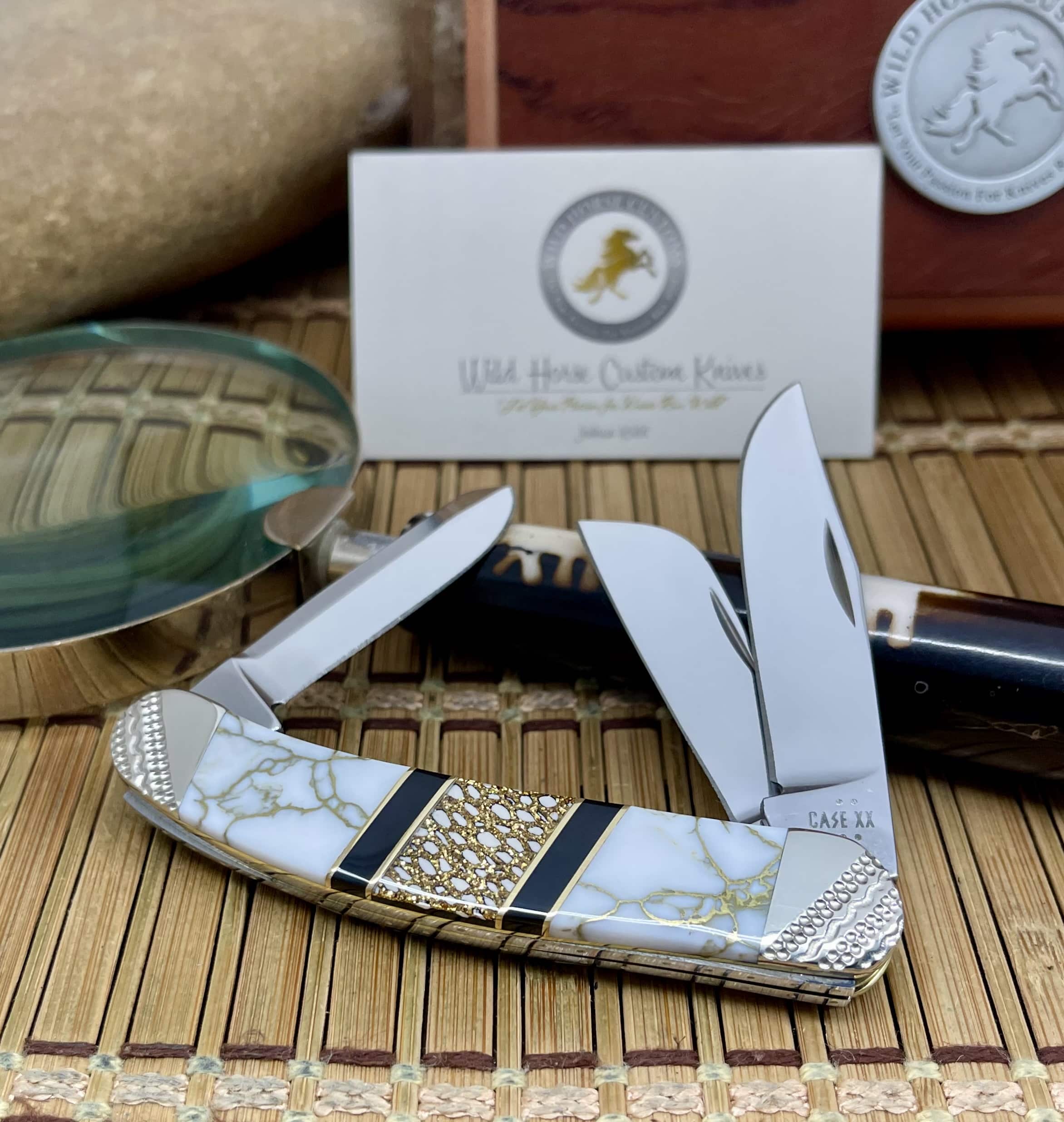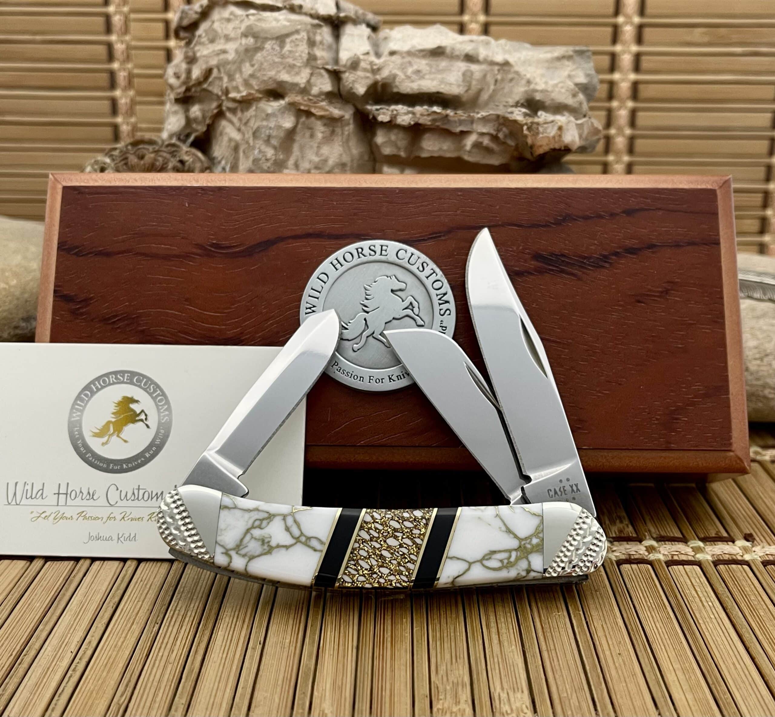 The case wild horse custom sowbelly knife is an exceptional limited-edition creation from master knifemaker J. Kidd, owner of Wild Horse Custom Knives. As #1 of only 5 produced, this piece combines artistry, precision, and rare natural materials in a classic Case XX pattern.