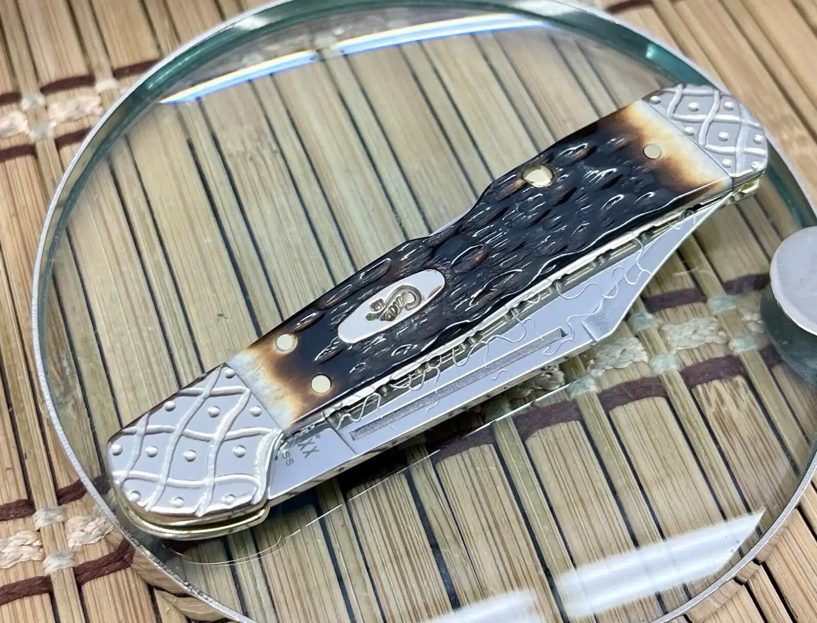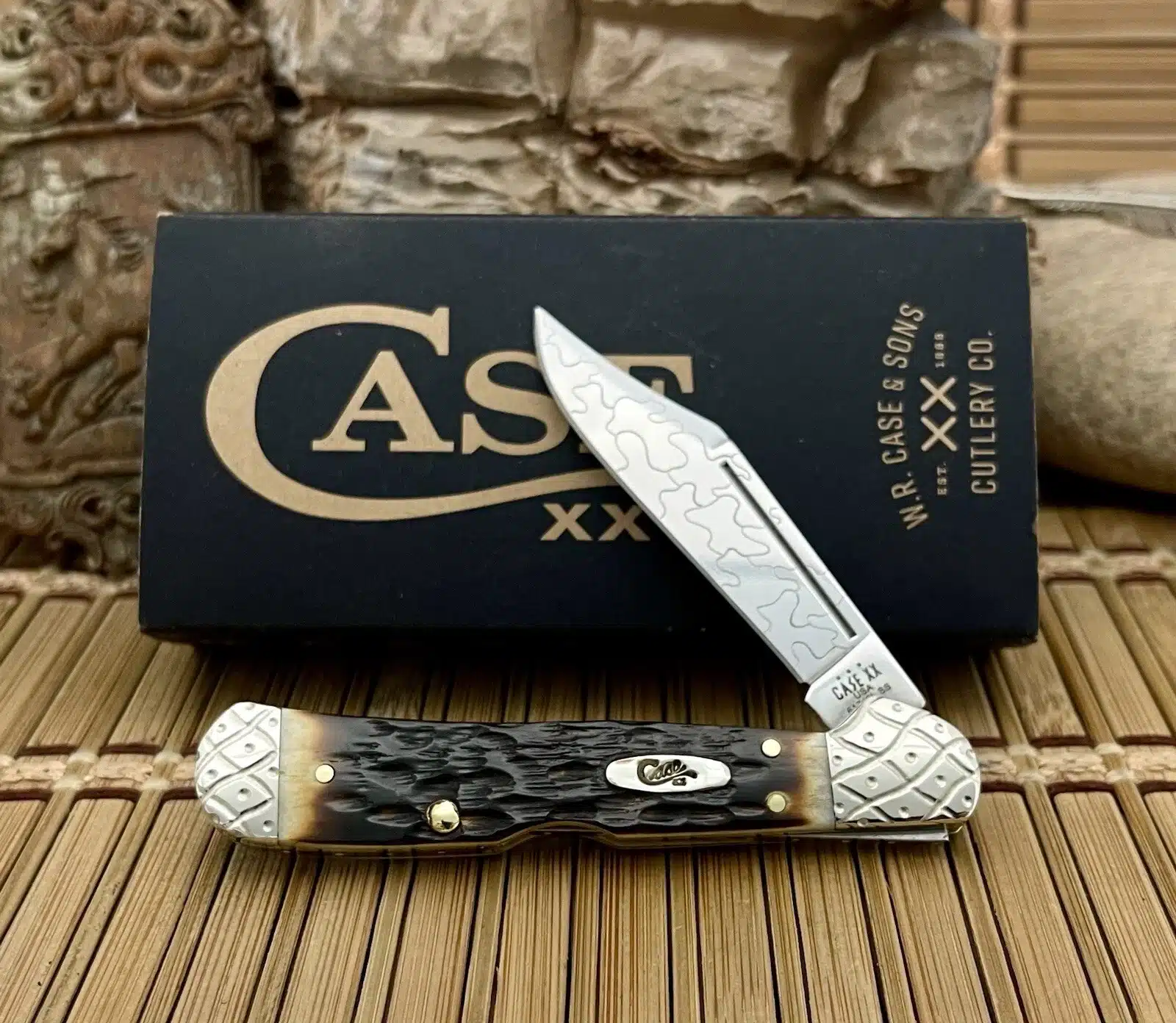 This Case XX mini copperlock pocket knife showcases rich hand-fired Peachseed Amber Bone handles that radiate depth and natural character. The engraved nickel-silver bolsters, fileworked liners, and worked backspring are meticulously detailed, giving the knife an elevated, collector-grade finish.