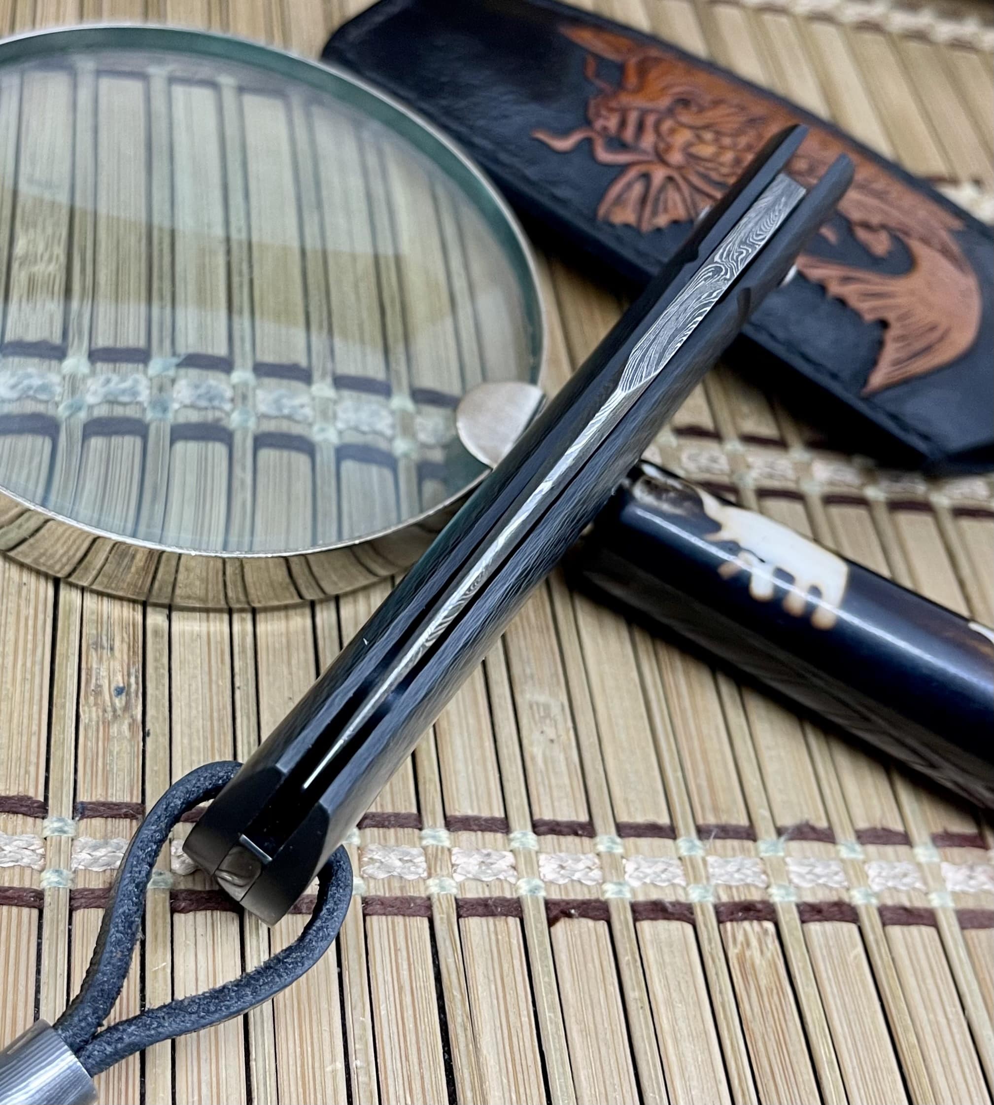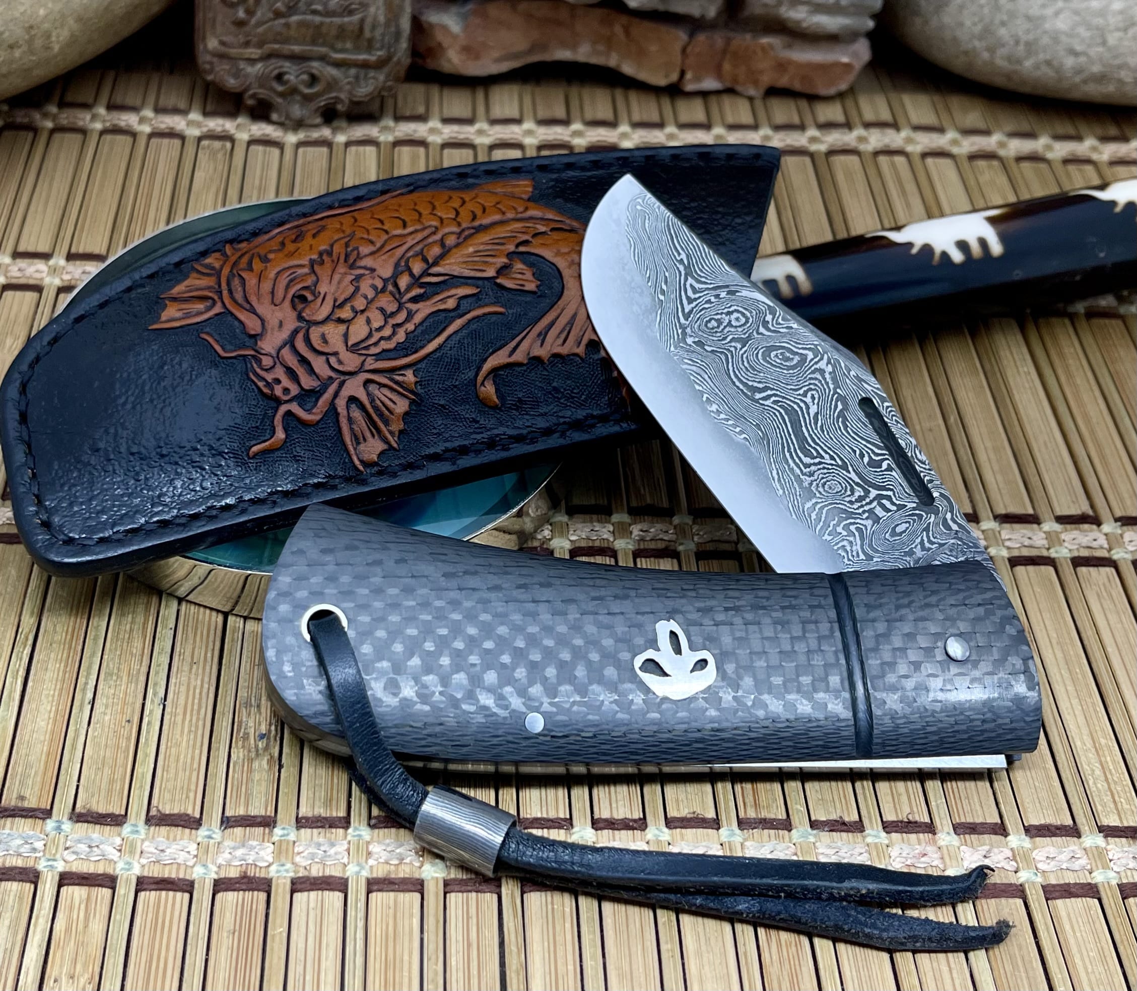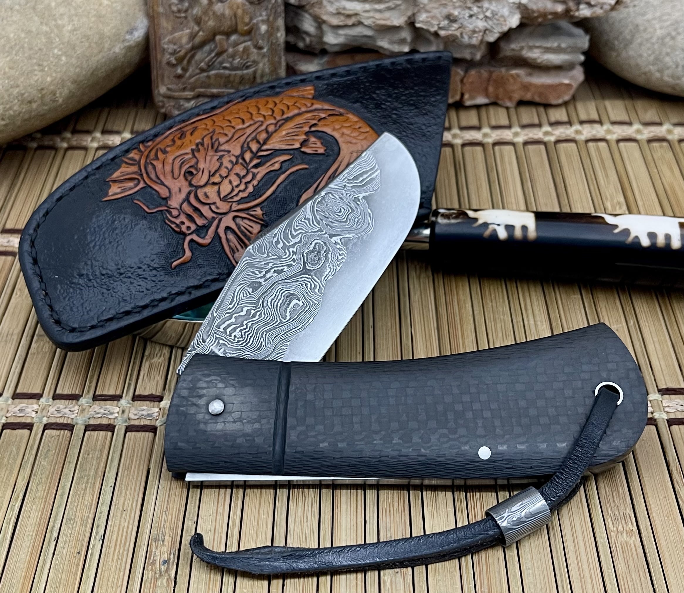 This franck souville bad guy damascus carbon fiber slipjoint knife is an ultra-rare, one-of-a-kind handmade piece from French knifemaker Franck Souville of Montgesoye, France – the very knife featured in a Blade Gallery video that inspired the Böker Bad Guy production series. It embodies Souville’s signature blend of traditional craftsmanship and modern design.