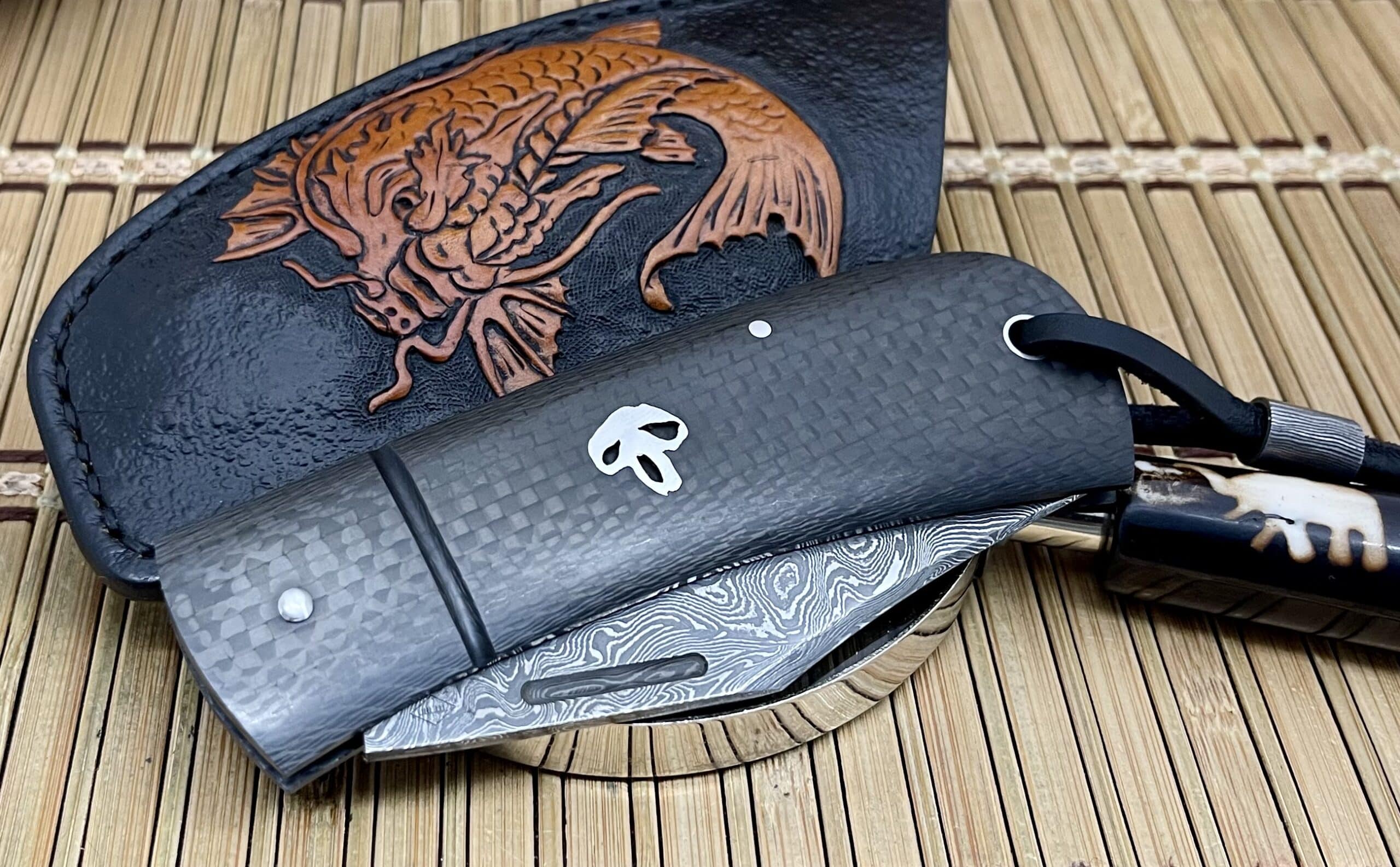 Its handle features precision-fit carbon fiber scales secured by pins and an inlaid Souville skull icon on the left scale. The oxidized and antiqued backspring blends seamlessly with the dark carbon fiber, giving the knife a striking modern contrast. A hand-tooled custom leather sheath and damascus lanyard bead complete this exceptional presentation.
